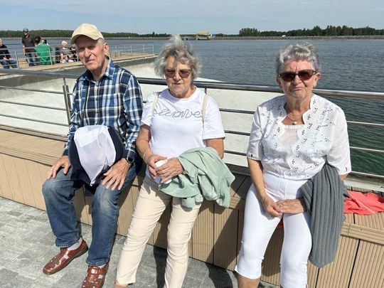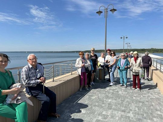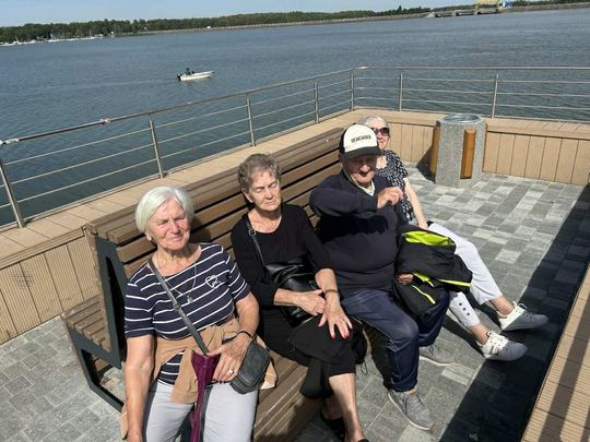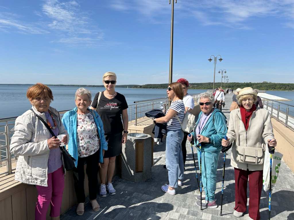 Po części historycznej przyszedł czas na spacer nad Zalewem Sulejowskim. Seniorzy ruszyli promenadą w stronę molo, podziwiając szeroką plażę, taflę wody i zieleń wokół akwenu. Słoneczne popołudnie zachęcało do zdjęć, a widok jeziora działał kojąco i… apetycznie – dlatego dodatkową atrakcją była przerwa na wyśmienity lodowy deser.