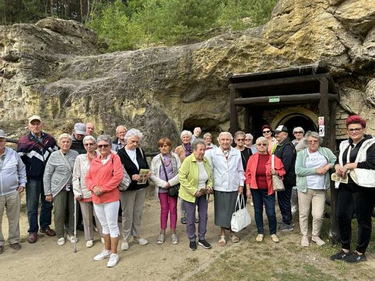 Pierwszym przystankiem były Groty Nagórzyckie. Z profesjonalnym przewodnikiem grupa zeszła pod ziemię, słuchając opowieści o historii tego miejsca, pracy dawnych górników i tajemnicach piaskowcowych korytarzy. Kameralna trasa sprzyjała ciekawym pytaniom i wspomnieniom – nie zabrakło też chwil zachwytu nad grą świateł na surowych ścianach grot.