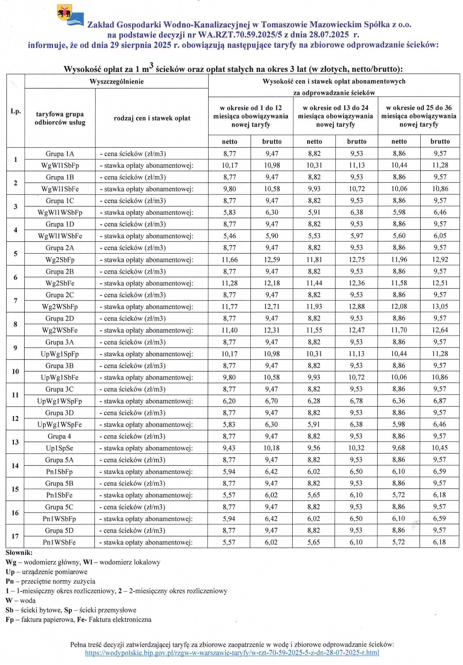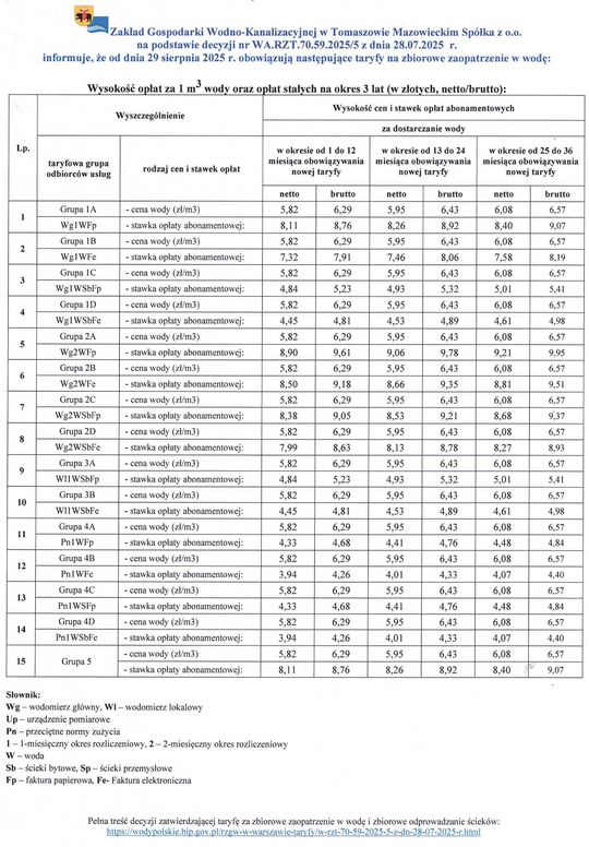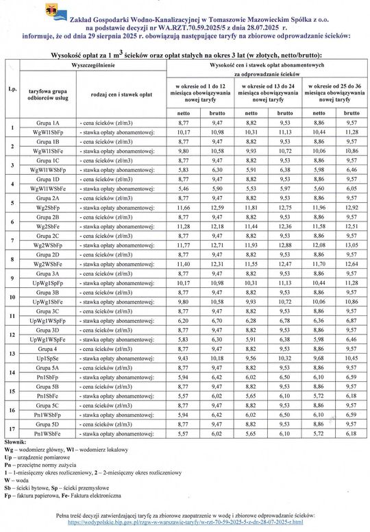 Zakład Gospodarki Wodno-Kanalizacyjnej w Tomaszowie Mazowieckim otrzymał zgodę Wód Polskich na wcześniejsze zakończenie dotychczasowej taryfy i wprowadzenie nowej – na 3 lata – od 29 sierpnia 2025 r. Zmiany najmocniej uderzą w cenę wody oraz w opłaty abonamentowe. Cena ścieków w pierwszym roku pozostaje bez zmian (symboliczna indeksacja nastąpi dopiero po 12 miesiącach).