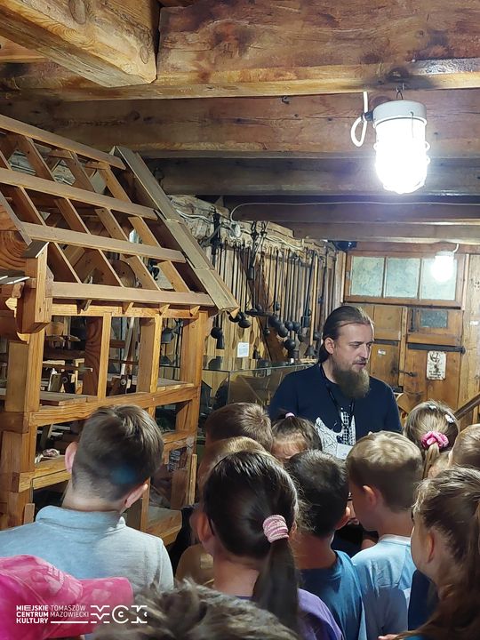 Nie zabrakło zwiedzania skansenu. Dawny młyn wodny pobudza wyobraźnię: skrzypiące schody, chłód kamiennych ścian i drewniane mechanizmy, które przez dziesięciolecia zamieniały ziarno w mąkę. Przewodnicy opowiadali o tym, jak powstawał chleb — od zasiewu po bochen wyjęty z pieca — a uczniowie z ciekawością zaglądali do kufrów, dzież, baryłek i mis, próbując odgadnąć, do czego służyły przedmioty, które dawniej stały w każdej izbie. W części folklorystycznej szczególną popularnością cieszyły się instrumenty i elementy wyposażenia, które dziś oglądamy już tylko w muzeach lub na rodzinnych zdjęciach.
