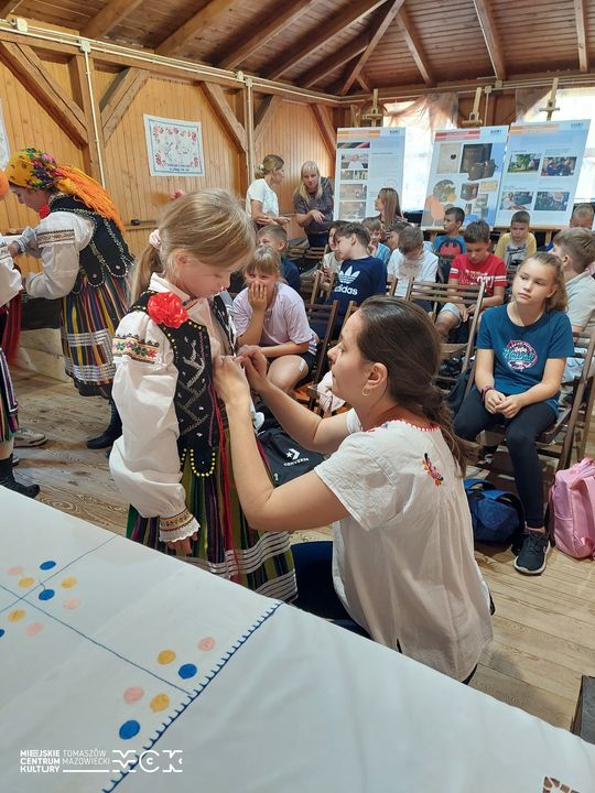 Już sam widok gości w regionalnych strojach wystarczył, by dzieci przystanęły z zachwytem. Czerwień gorsetów, zieleń zapasek, pasiaste spódnice i kwieciste chusty nie były jedynie kostiumem — każda część garderoby miała swoją funkcję i znaczenie. Uczniowie dowiedzieli się, czym różni się ubiór świąteczny od codziennego, dlaczego męskie pasy tkano tak gęsto i skąd brały się kolory, które dziś kojarzymy z opoczyńską, rawską i łowicką ornamentyką. Kiedy gospodynie prezentowały wyszywane wzory, w sali słychać było ciche „wow”; okazało się, że ręczna robota i cierpliwość robią nie mniejsze wrażenie niż najnowsze aplikacje.