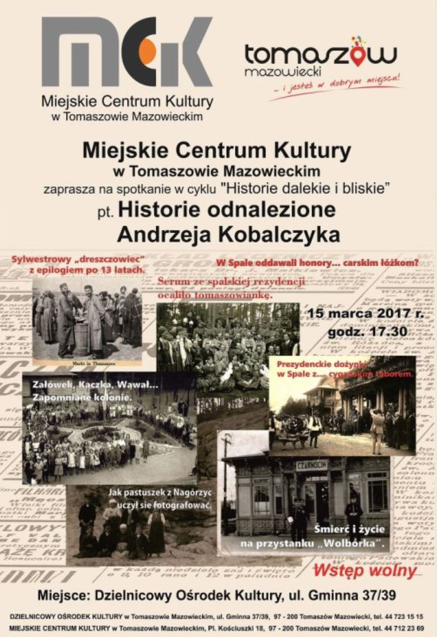 W dniu 15 marca o godz. 17.30 w sali ośrodka przy ul. Gminnej 37/39 o "historiach przez siebie odnalezionych" opowie gość wieczoru Andrzej Kobalczyk.