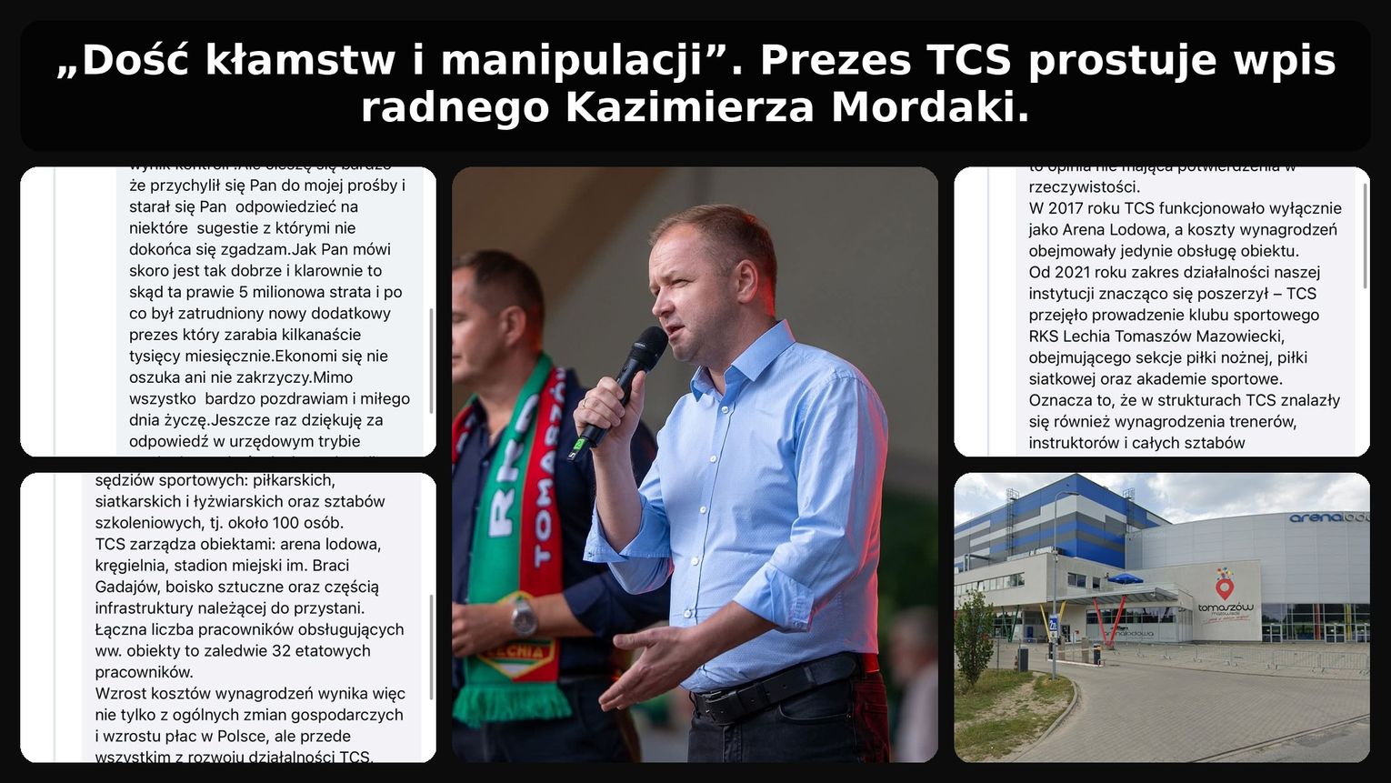 Na wstępie należy wskazać na błąd natury podstawowej: radny pomylił samorządy. Kazimierz Mordaka zasiada w Radzie Powiatu Tomaszowskiego, tymczasem Tomaszowskie Centrum Sportu jest spółką samorządu miejskiego, zarządzaną przez Miasto Tomaszów Mazowiecki. Rozliczanie TCS z perspektywy powiatu wprowadza opinię publiczną w błąd i kategoryczne stwierdzenia na podstawie doniesień prasowych i rzetelnej analizy faktów sugerują złą wolę i premedytację w działaniu.