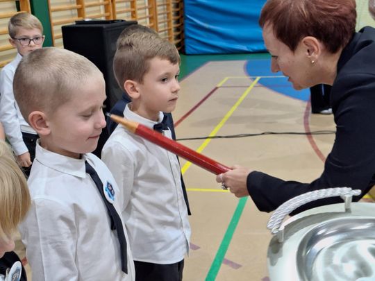 Najważniejszym momentem wydarzenia było uroczyste pasowanie na ucznia- symbolicznym dużym, czerwonym ołówkiem. Aktu pasowania dokonali kolejno zaproszeni goście oraz Pani Dyrektor Elżbieta Wilczyńska. Pierwszaki ślubowały być pilnymi uczniami, dobrymi kolegami i z dumą reprezentować swoją szkołę. Po złożeniu ślubowania zostali obdarowani upominkami ufundowanymi przez zaproszonych gości oraz rodziców.