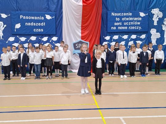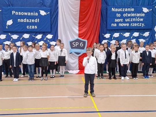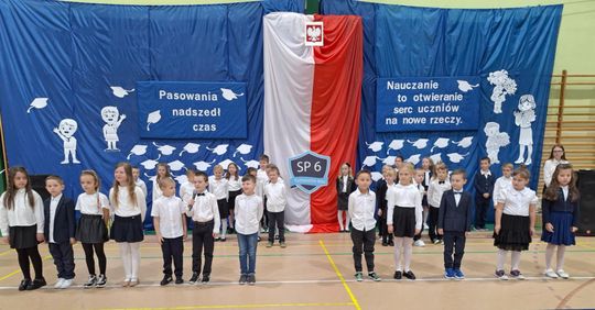 Pierwszoklasiści zaprezentowali wiersze i piosenki, pokazując, że chociaż dopiero zaczynają swoją szkolną przygodę, to nabyli już bardzo dużo umiejętności. Z wielką dumą śpiewali i mówili, że są Polakami oraz cieszą się, że będą uczniami „ Szóstki”, szkoły, gdzie każdy dzień jest wesoły.