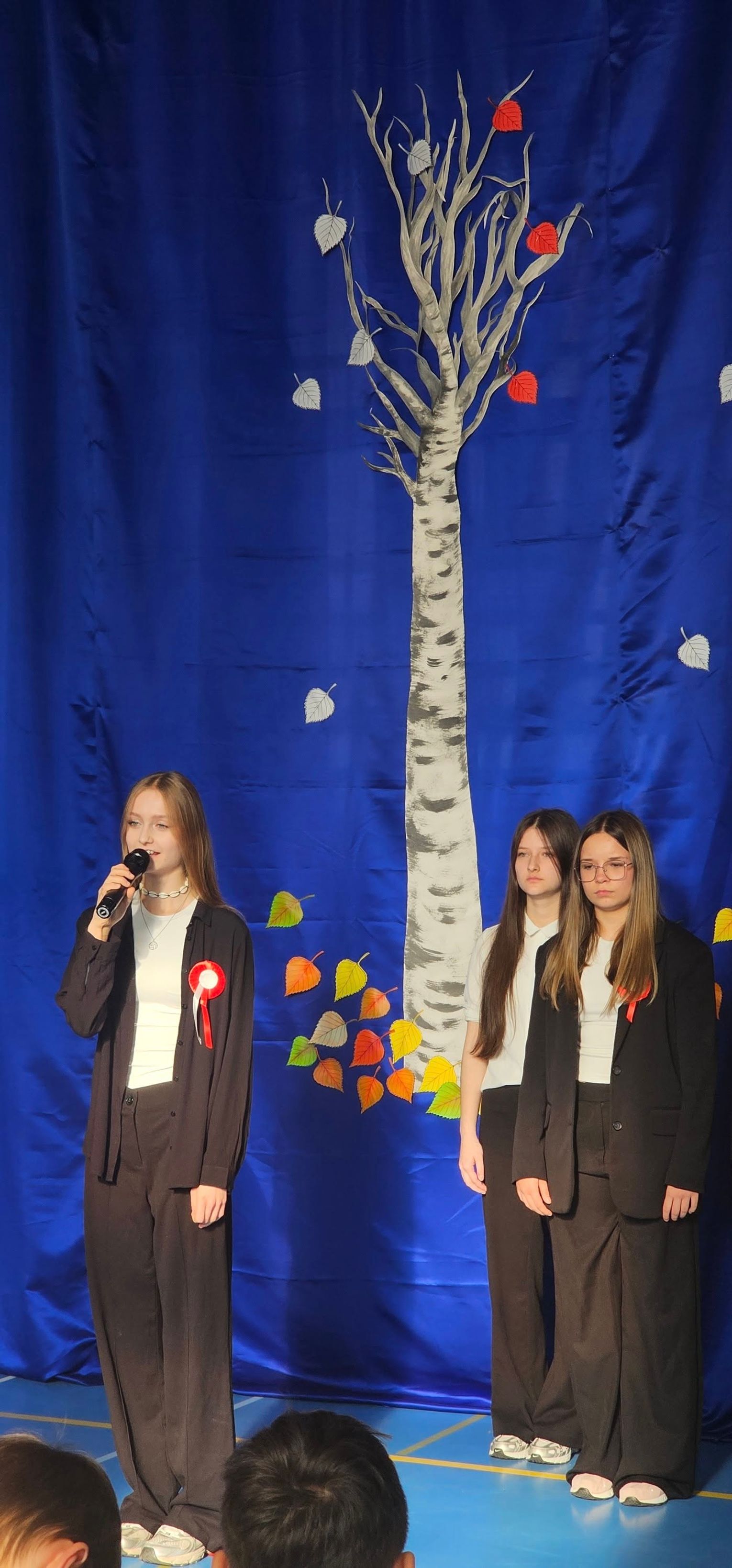 Na szkolnej scenie zabrzmiały wiersze patriotyczne, a także pieśni legionowe i niepodległościowe – wśród nich przejmujące „My, Pierwsza Brygada”. Przed oczami widzów zmieniały się tableau historyczne: mapy rozbiorów, fotografie żołnierzy i cywilów, symbole polskich dążeń do wolności. Młodzi recytatorzy opowiadali o cenie wolności, śpiew wzmagał emocje, a proste rekwizyty – biało-czerwone wstążki, rogatywki, znicze pamięci – dodawały przedstawieniu autentyzmu.