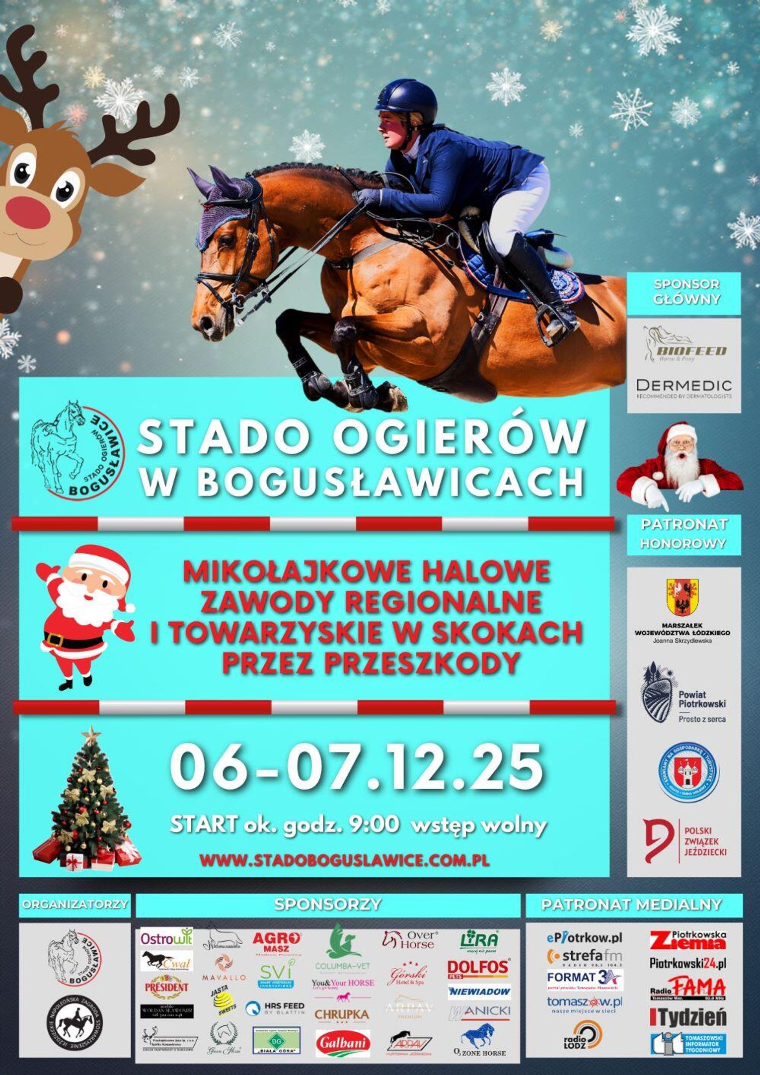 Sportowa część weekendu to tradycyjnie skoki przez przeszkody w randze regionalnej i towarzyskiej. Organizatorzy zachęcają zawodników do zgłoszeń – propozycje konkursów i szczegółowe informacje znajdują się w załączniku oraz na stronie Stada. Bogusławice gwarantują świetne warunki hali, sprawną obsługę i świąteczny nastrój, który dodaje skrzydeł zarówno koniom, jak i jeźdźcom. Wydarzenie odbywa się pod patronatem honorowym instytucji regionalnych i Polskiego Związku Jeździeckiego, a partnerzy i sponsorzy zadbali o to, by każdy gość spędził tu pełen wrażeń, zimowy weekend.