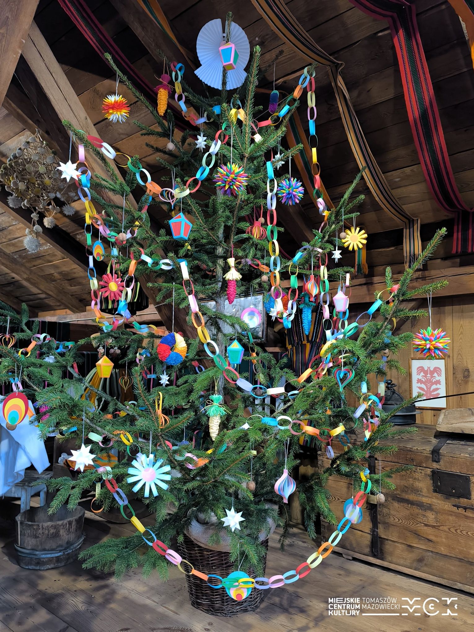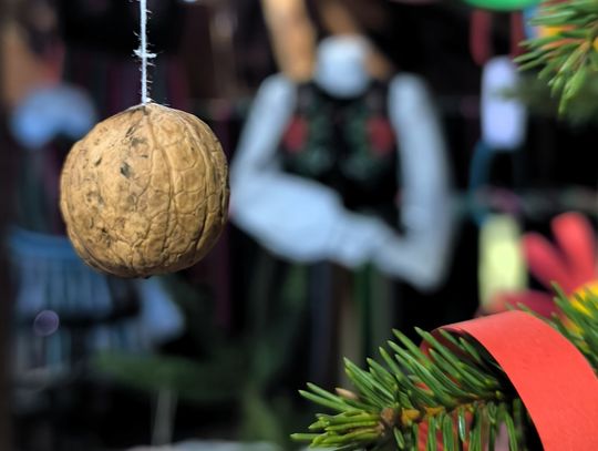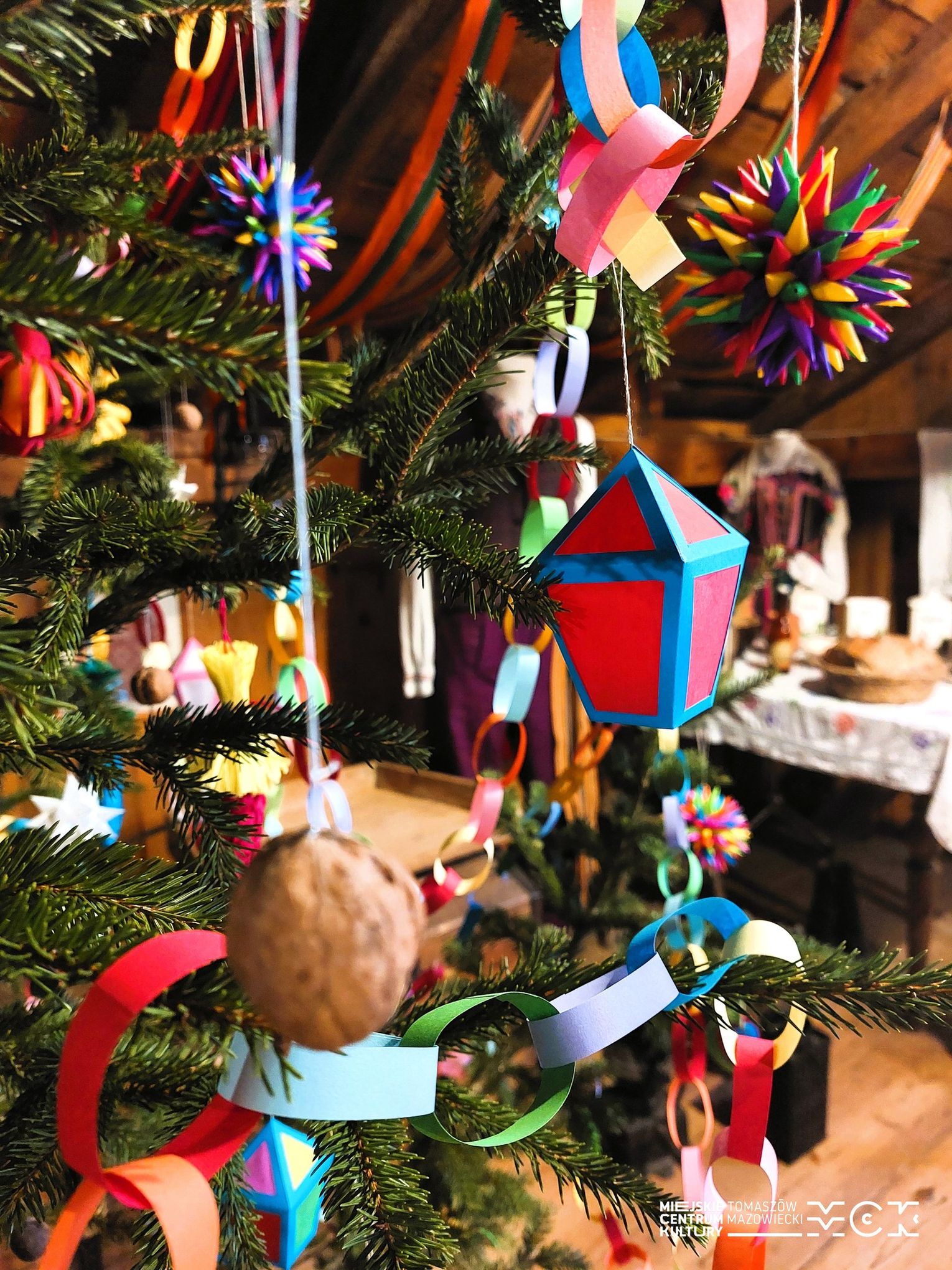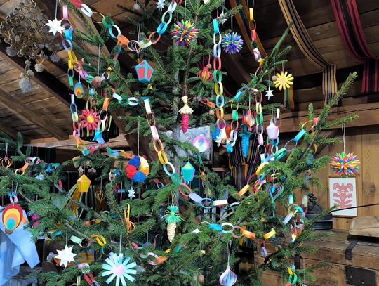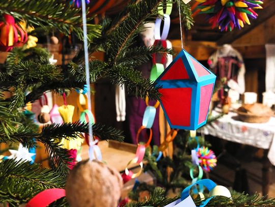 Wśród dawnych sprzętów, zapachów drewna i historii zapisanych w przedmiotach codziennych, stanęła choinka ubrana w ręcznie robione ozdoby. I to nie byle jakie! Zamiast współczesnych, błyszczących bombek zobaczycie na niej dekoracje, które wielu z nas pamięta z dzieciństwa – papierowe łańcuchy, ozdoby z kolorowego papieru, bibuły oraz orzechy. Dokładnie takie, jakie dawniej przygotowywano w nadpilickich domach: proste, urocze i pełne domowego czaru.