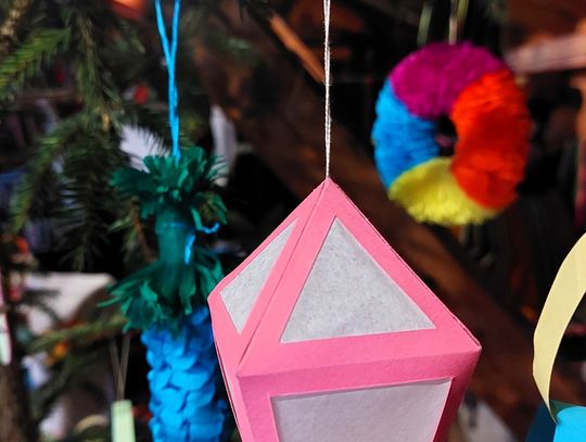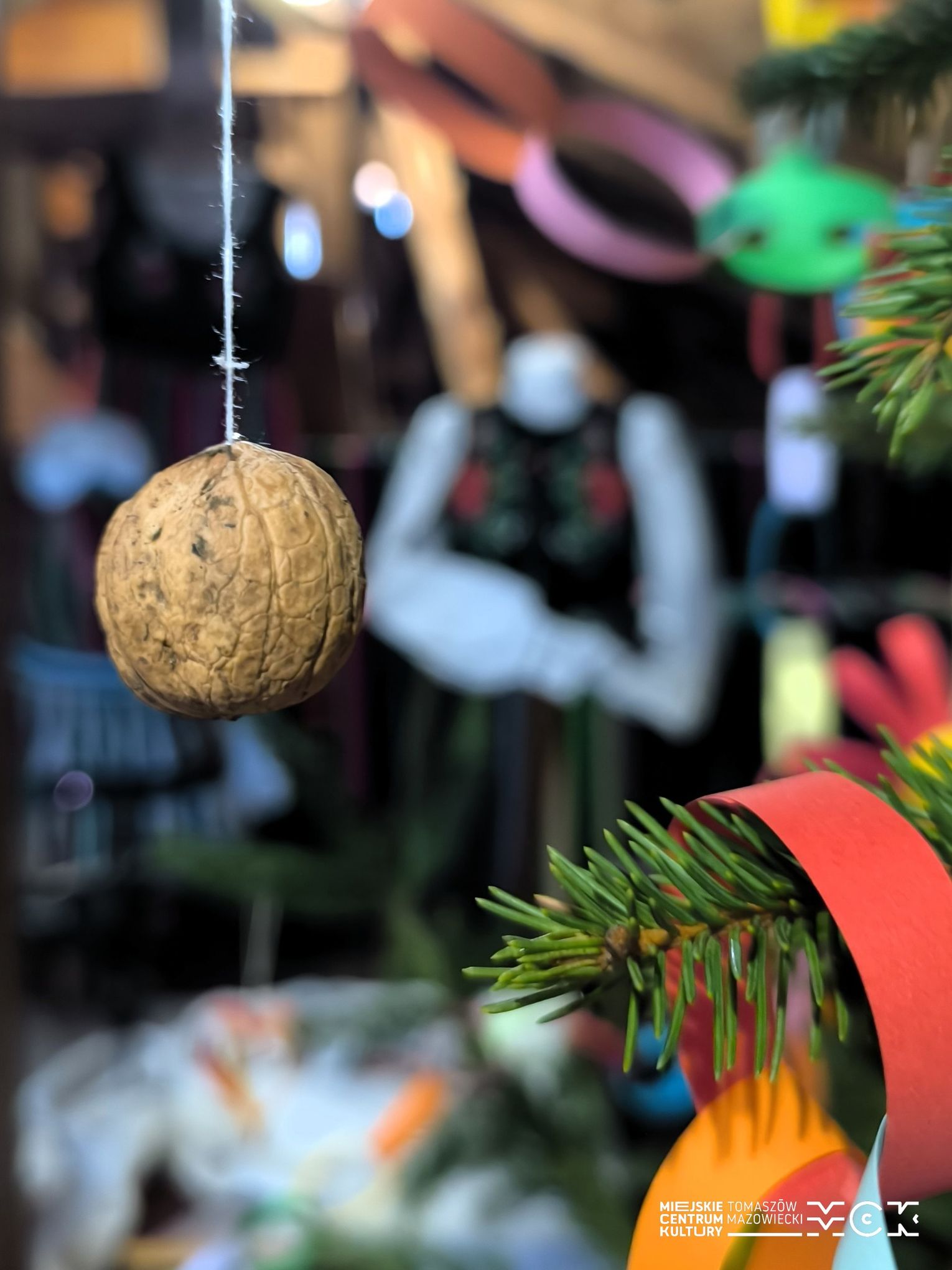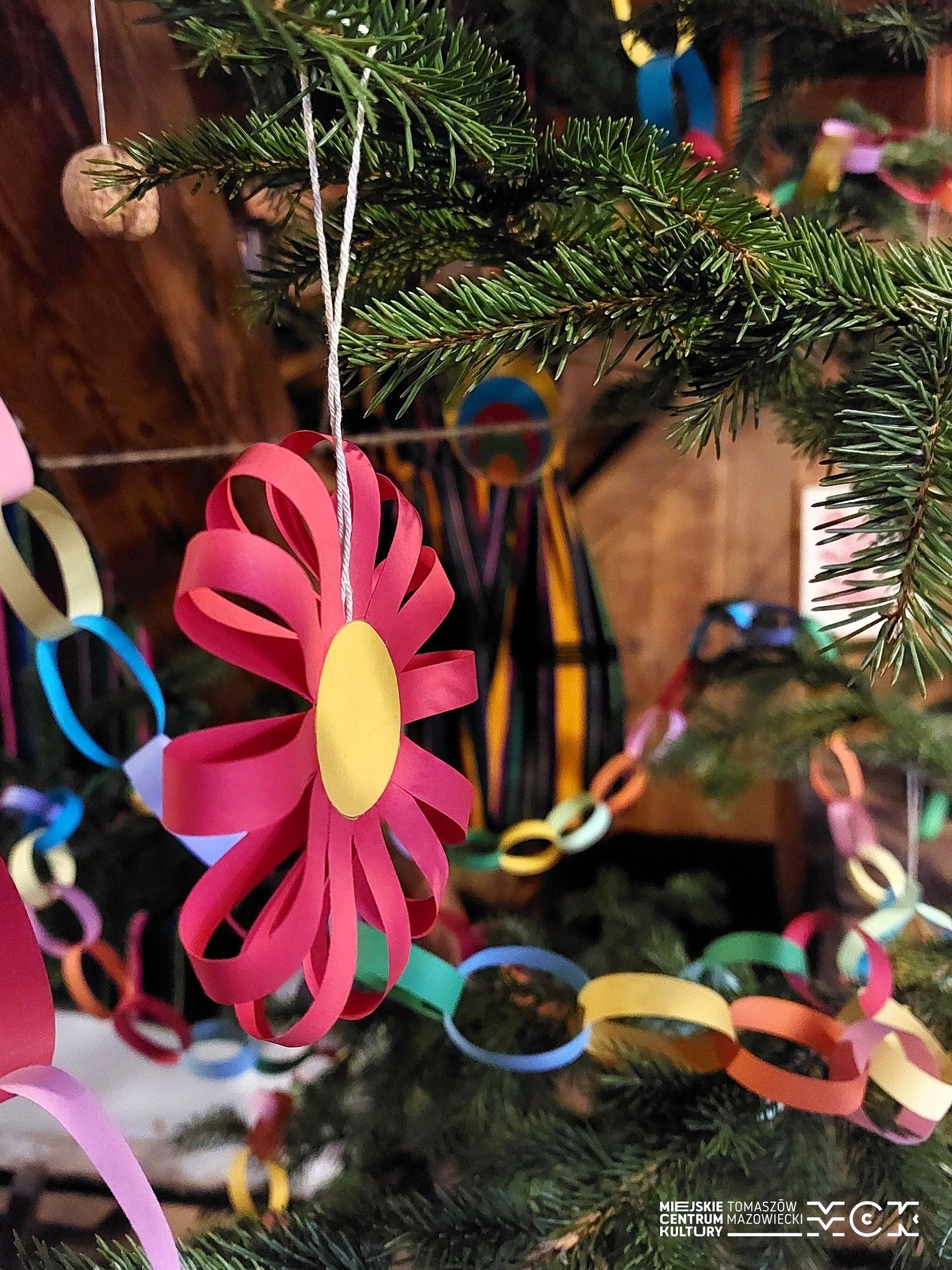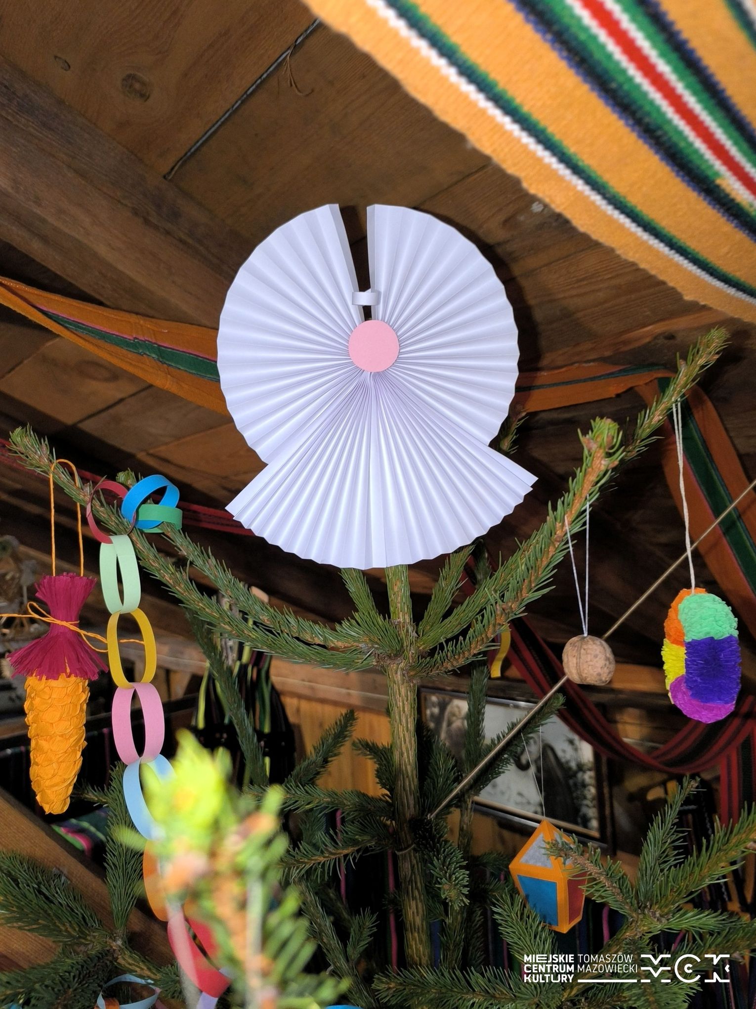 Wśród dawnych sprzętów, zapachów drewna i historii zapisanych w przedmiotach codziennych, stanęła choinka ubrana w ręcznie robione ozdoby. I to nie byle jakie! Zamiast współczesnych, błyszczących bombek zobaczycie na niej dekoracje, które wielu z nas pamięta z dzieciństwa – papierowe łańcuchy, ozdoby z kolorowego papieru, bibuły oraz orzechy. Dokładnie takie, jakie dawniej przygotowywano w nadpilickich domach: proste, urocze i pełne domowego czaru.