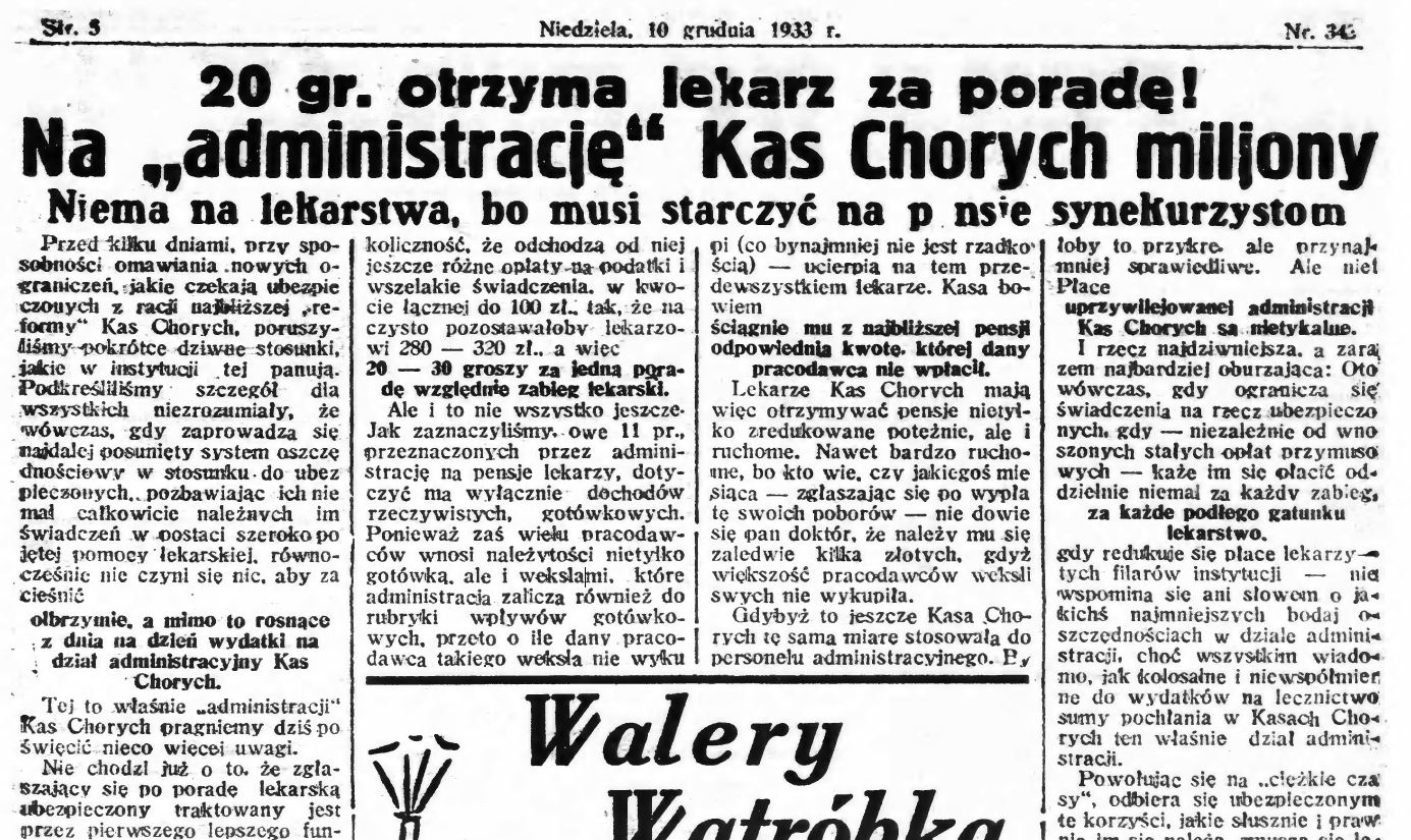 Powołując się na „ciężkie czasy”, odbiera się ubezpieczonym te korzyści, jakie słusznie i prawnie im się należą, zmusza się lekarzy do pracy za półdarmo — ale personel administracji nieustannie się powiększa, bez względu na to, czy zachodzi potrzeba czy nie. W sprawach tych decydują zazwyczaj wpływy zakulisowe i one to sprawiają, że na miejsce jednego zredukowanego pod pozorem oszczędności urzędnika przyjmuje się od razu trzy inne siły, niewykwalifikowane, ale za to wsparte o silne „plecy”.