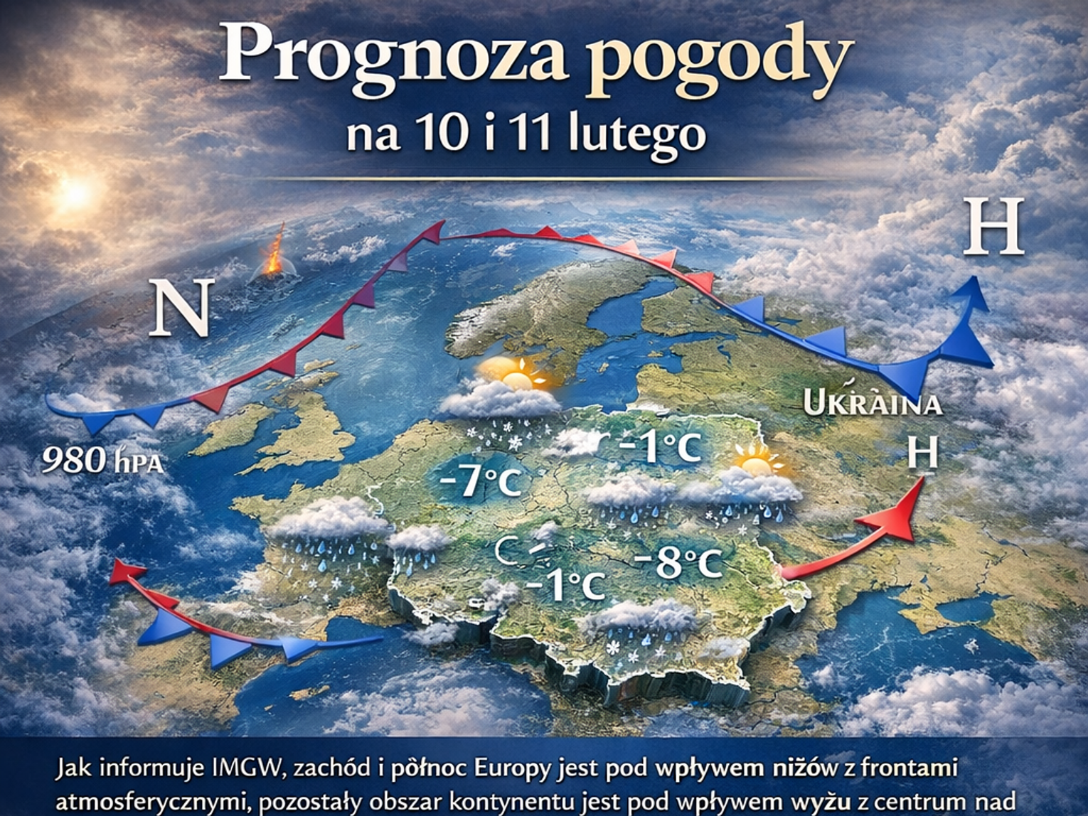 We wtorek w kraju zachmurzenie duże z większymi przejaśnieniami, okresami na południowym wschodzie z rozpogodzeniami. Miejscami głównie na północy słabe opady śniegu. Na południu, w centrum i na wschodzie opady deszczu ze śniegiem i deszczu, przejściowo opady marznącego deszczu powodujące gołoledź. Temperatura maksymalna od -7 st. C na północnym wschodzie, około 1 st. C w centrum do 7 st. C, 8 st. C na południowym zachodzie i południu. Wiatr słaby, na obszarach podgórskich Karpat umiarkowany i porywisty, w rejonach podgórskich Podkarpacia okresami dość silny, w porywach do około 60 km/h. Wysoko w Bieszczadach porywy wiatru do 70 km/h.