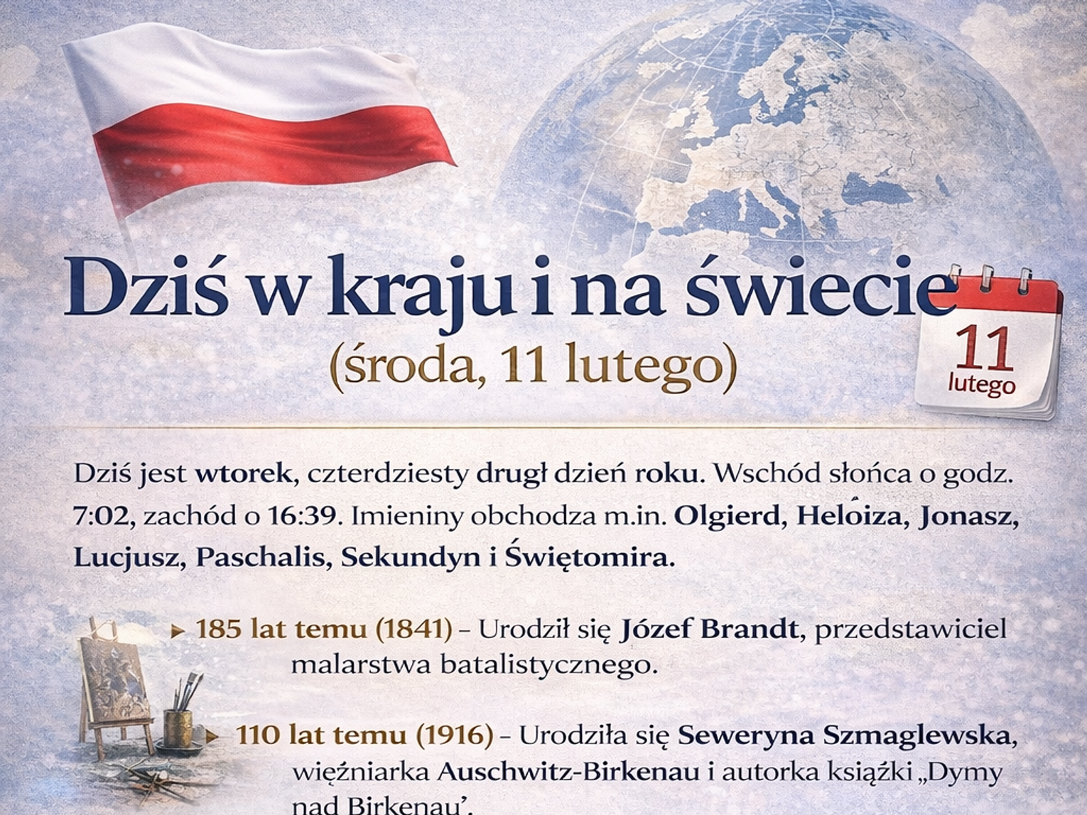 110 lat temu (1916) urodziła się Seweryna Szmaglewska (zm. 1992), pisarka, więźniarka niemieckiego obozu Auschwitz-Birkenau, świadek na procesie norymberskim; autorka książki „Dymy nad Birkenau” i powieści dla młodzieży „Czarne stopy”.