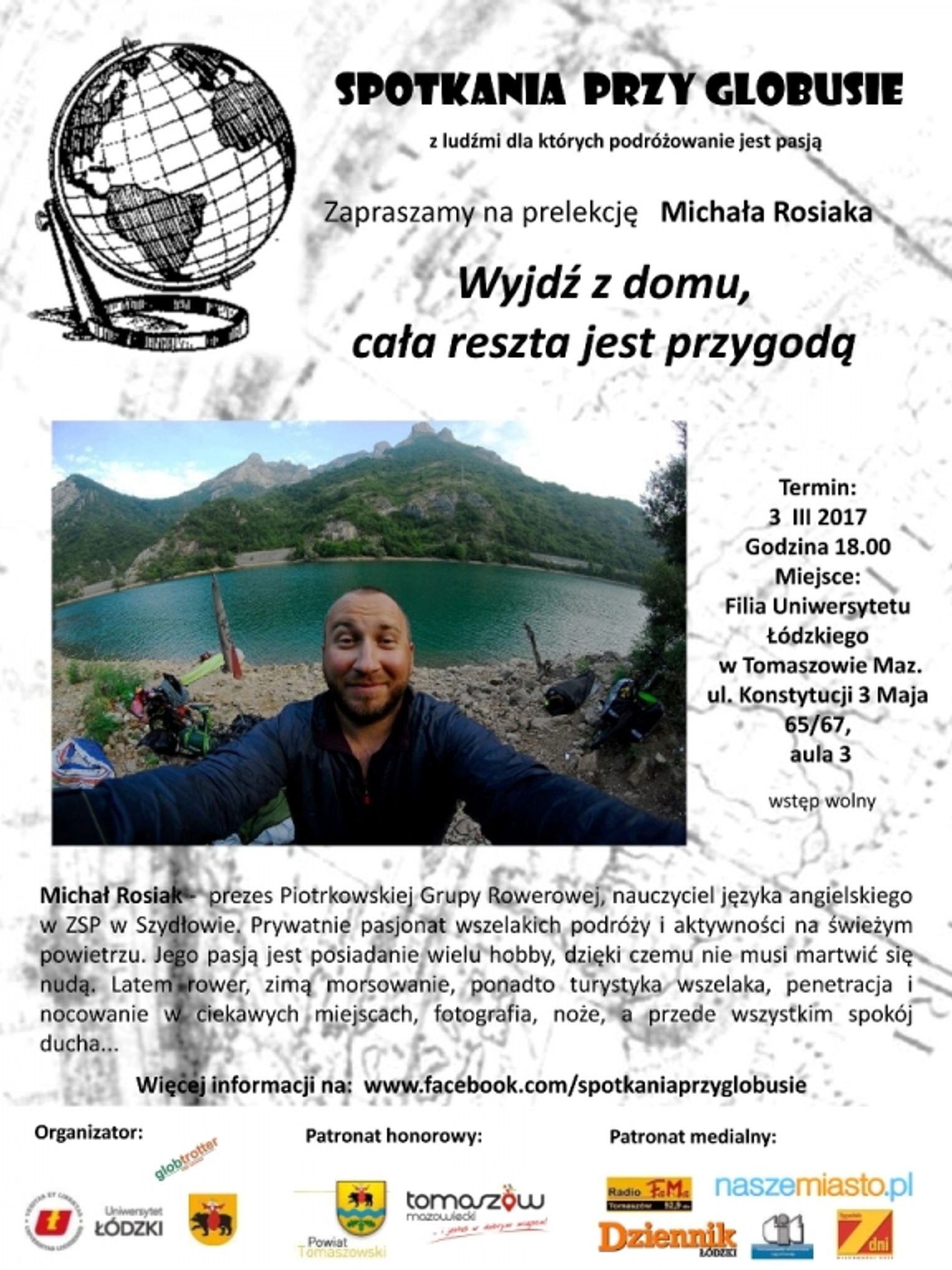 3 marca o godzinie 18.00 w budynku Filii Uniwersytetu Łódzkiego, wstęp wolny. Naszym gościem będzie Michał Rosiak- prezes Piotrkowskiej Grupy Rowerowej, nauczyciel języka angielskiego w ZSP w Szydłowie. Prywatnie pasjonat wszelakich podróży i aktywności na świeżym powietrzu. Jego pasją jest posiadanie wielu hobby, dzięki czemu nie musi martwić się nudą. Latem rower, zimą morsowanie, ponadto turystyka wszelaka, penetracja i nocowanie w ciekawych miejscach, fotografia, noże, a przede wszystkim spokój ducha...
