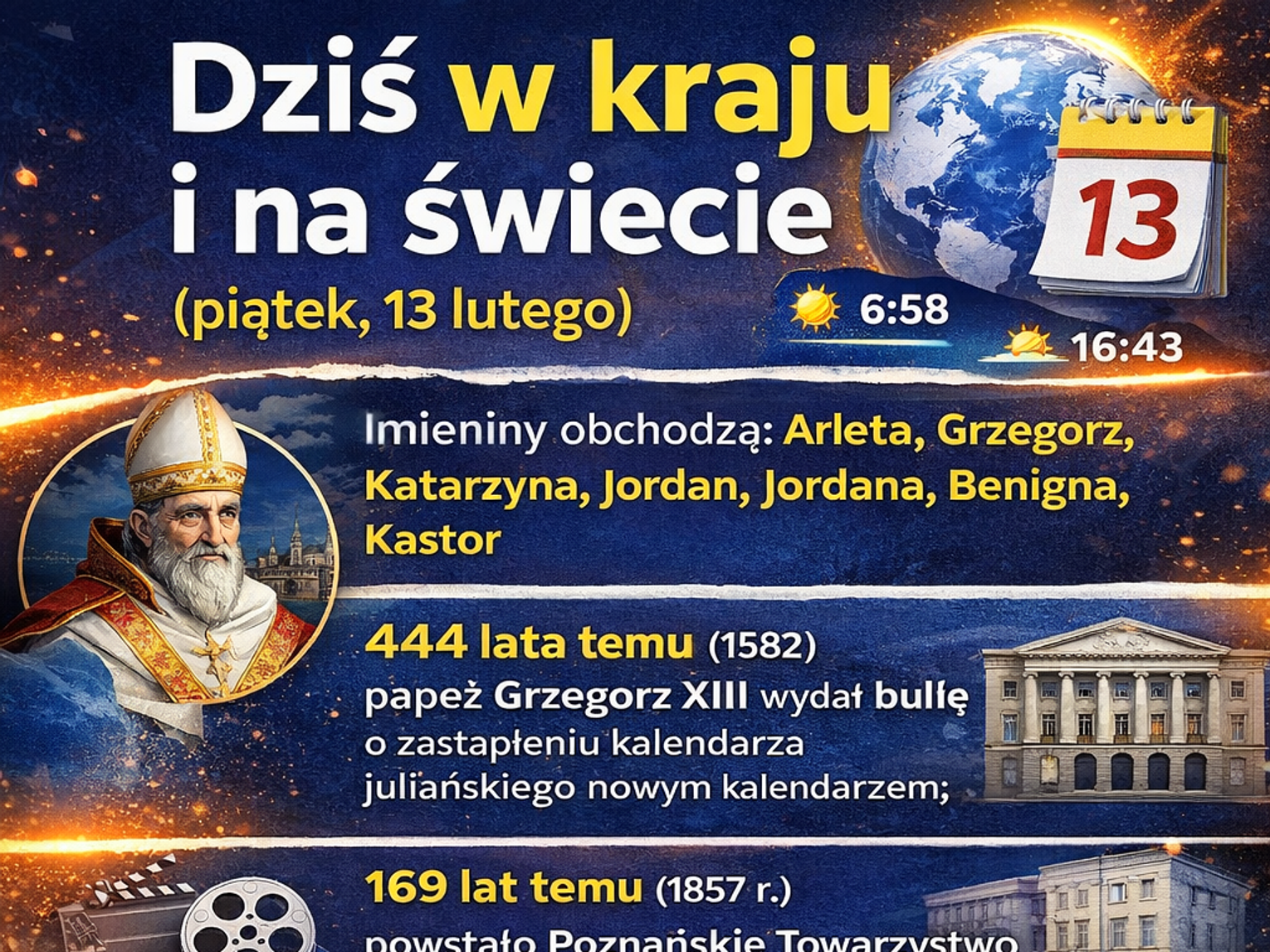 444 lata temu (1582) papież Grzegorz XIII wydał bullę o zastąpieniu kalendarza juliańskiego nowym kalendarzem; tzw. gregoriańskim, który jest używany do czasów współczesnych.