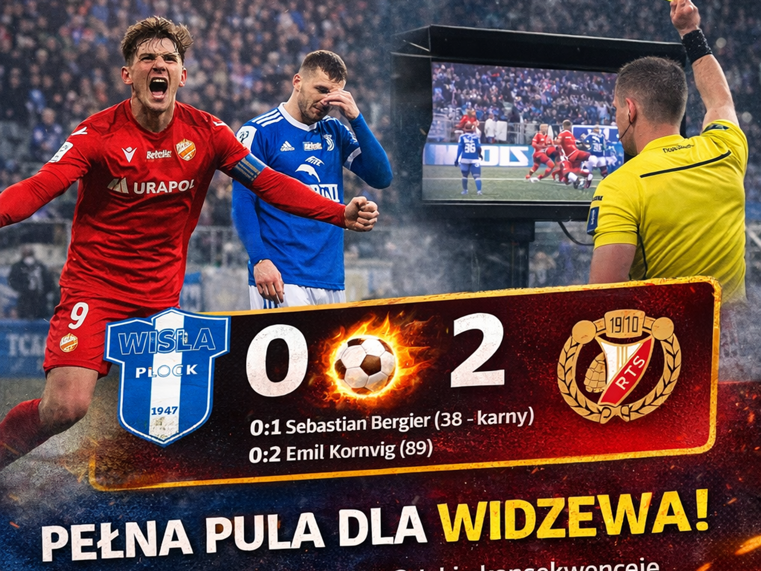 Tuż po 30. minucie gry, po akcji na polu karnym, piłkarze Widzewa sugerowali, że Marcus Haglind-Sangre zagrał ręką. Po sprawdzeniu VAR, sędzia Gryckiewicz zdecydował o rzucie karnym dla Widzewa. Stały fragment gry nie mógł od razu być wykonany, bo boisko zostało całkowicie zadymione. W 38. min Rafała Leszczyńskiego pokonał z 11 metrów Sebastian Bergier. Była to pierwsza strzelona bramka w sobotnich meczach ekstraklasy.