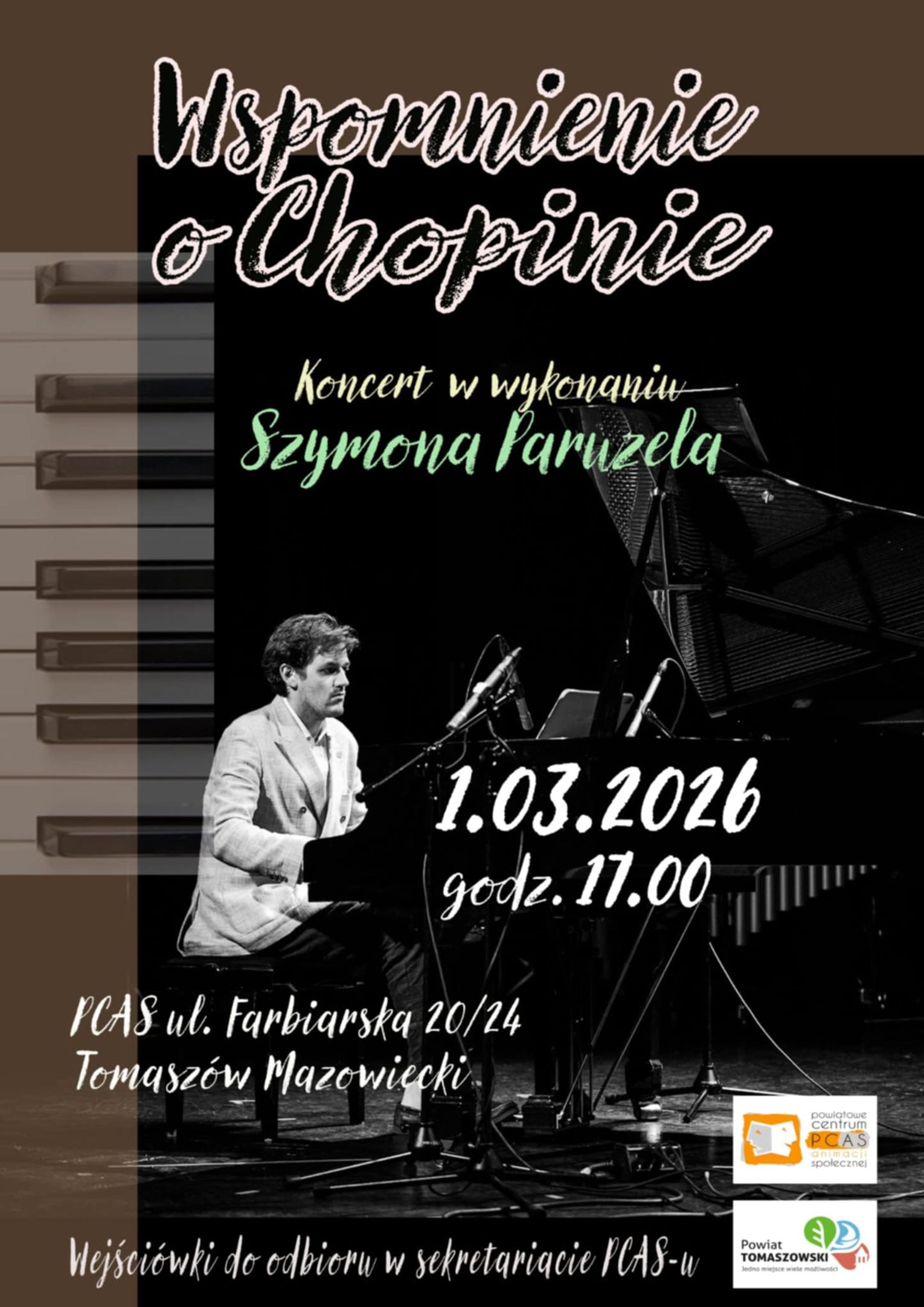 – Z ogromną przyjemnością zapraszam na wyjątkowy koncert, organizowany przez nas, by wspólnie świętować 216. rocznicę urodzin Fryderyka Chopina – jednego z najwybitniejszych kompozytorów w historii muzyki i dumy naszej kultury. To dla nas zawsze niezwykłe wydarzenie, do którego co roku zapraszamy wybitnych wykonawców – mówi Dorota Ignasiak, dyrektor PCAS-u. – Tym razem będzie to młody, utalentowany pianista Szymon Paruzel, który swoje pierwsze muzyczne kroki stawiał właśnie w Tomaszowie. W nastrojowej atmosferze zabrzmią najpiękniejsze utwory mistrza fortepianu: pełne emocji nokturny i ballady, a także mazurki i polonezy, w których wybrzmiewa polski duch. Koncert będzie okazją do wspólnego przeżywania muzyki, która od pokoleń porusza serca słuchaczy na całym świecie – a nas, Polaków, chyba najbardziej. Zapraszam miłośników muzyki klasycznej, mieszkańców miasta i powiatu oraz wszystkich, którzy chcą spędzić wieczór w wyjątkowym, artystycznym klimacie.