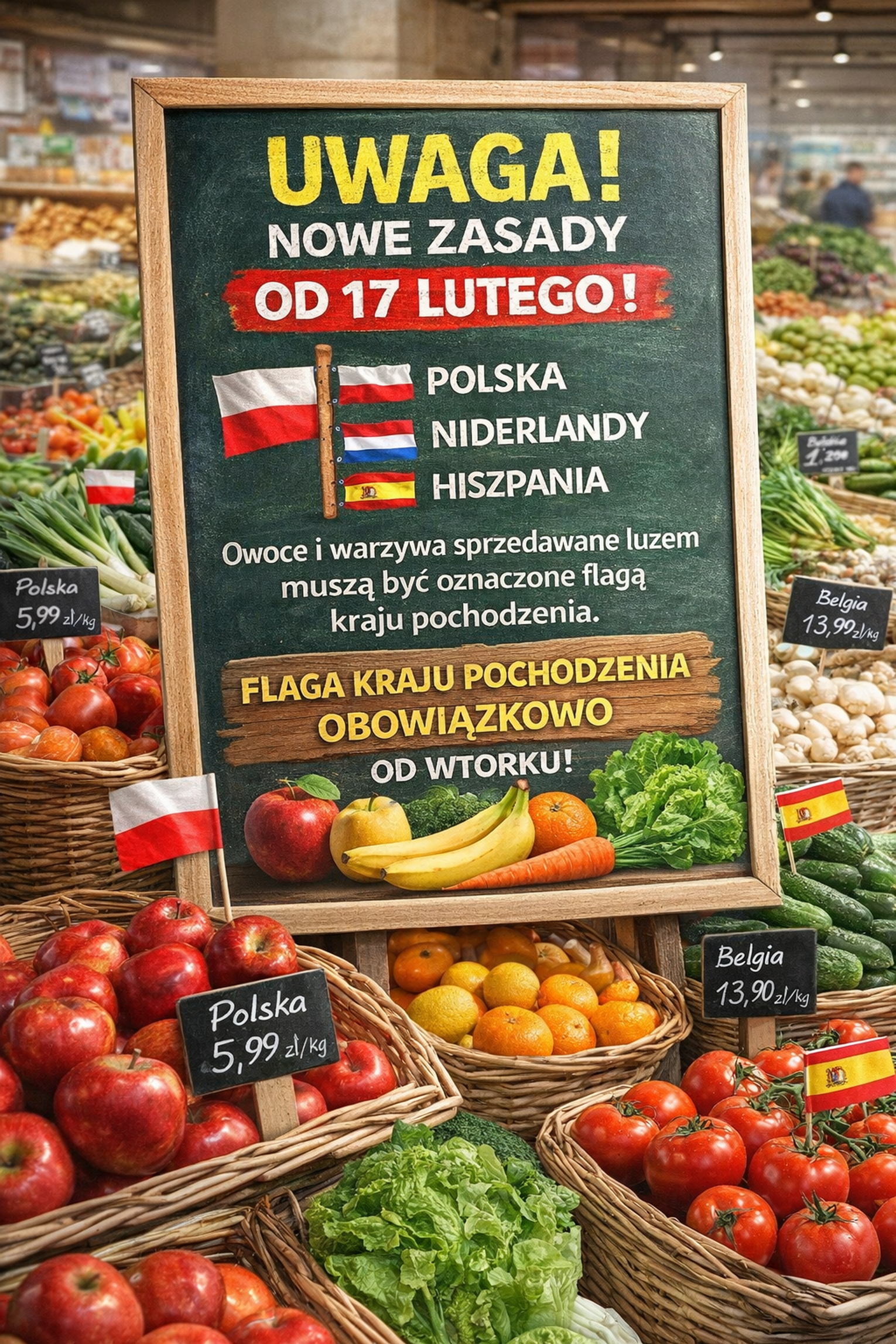 Od 17 lutego 2026 r. zgodnie z rozporządzeniem Ministra Rolnictwa i Rozwoju Wsi obowiązywać będą nowe zasady znakowania żywności: świeże owoce i warzywa sprzedawane luzem będą musiały być oznaczane flagą kraju pochodzenia. Według resortu ma to zapewnić konsumentom bardziej czytelną informację o kraju pochodzenia produktów - zarówno w formie słownej, jak i graficznej. W ocenie ministra rolnictwa takie rozwiązanie ma zwiększyć transparentność rynku i umożliwić konsumentom podejmowanie świadomych wyborów zakupowych.