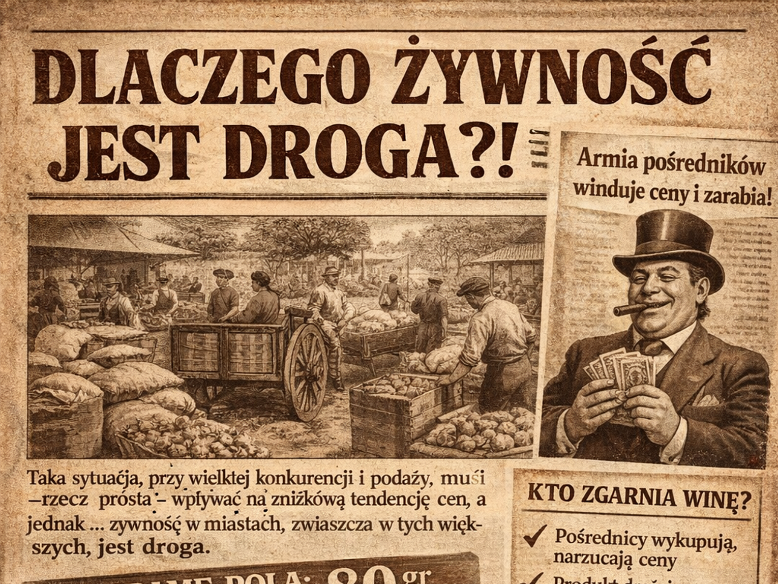 Utarło się przekonanie, że w Polsce żywność jest tania. Że rolnictwo, wobec katastrofalnej sytuacji, wyprzedaje ziemiopłody niżej wszelkich norm i cenników. Że chłop, który sam nie dojada i suchym chlebem się kontentuje, wywozi nabiał do miasta, by zarobić choć parę złotych — na paszę dla krów, na obrok dla konia.