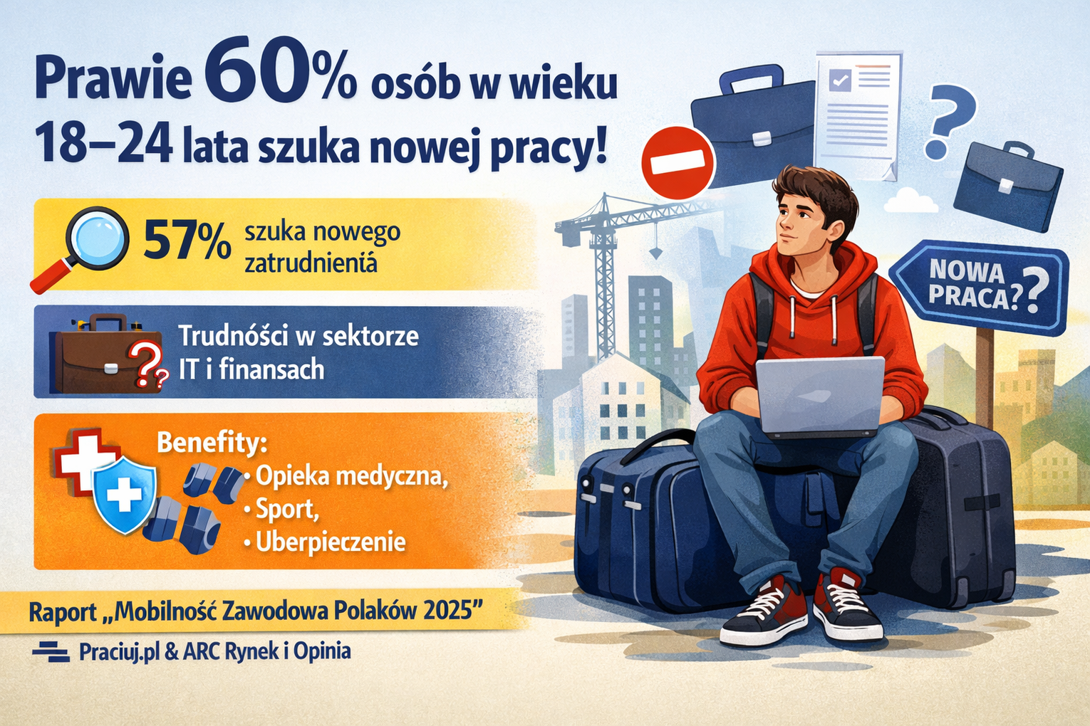 Z opublikowanego w poniedziałek badania wynika, że 38 proc. Polaków aktywnie poszukuje pracy; w grupie 18–24 lata odsetek ten wynosi 57 proc., a w wieku 25–34 lat - 47 proc. Oferty dla osób rozpoczynających karierę – obejmujące role asystenckie, juniorskie oraz stażowe – stanowiły 13,9 proc. wszystkich ogłoszeń w serwisie Pracuj.pl. Średnia z 2025 roku wyniosła 14,4 proc.