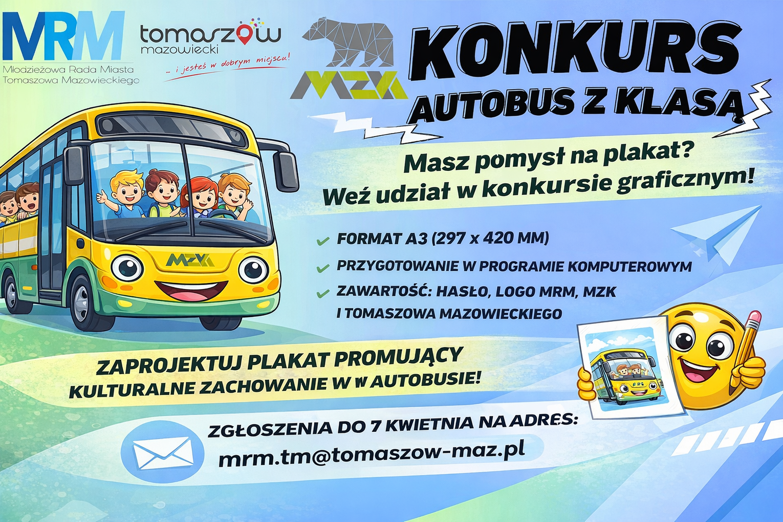 Zadaniem uczestników jest przygotowanie autorskiego plakatu zachęcającego do życzliwego i odpowiedzialnego zachowania podczas podróży komunikacją miejską. Projekty powinny zawierać hasła promujące dobre praktyki w autobusach – np. ustępowanie miejsca osobom starszym, utrzymywanie czystości czy uprzejmość wobec współpasażerów.