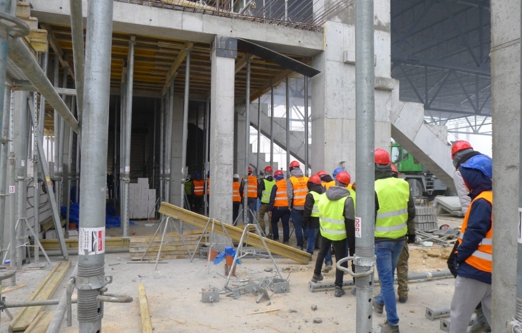 Dzięki uprzejmości Prezydenta Miasta Tomaszowa Mazowieckiego – Pana Marcina Witko, Dyrektora Wydziału Inwestycji Urzędu Miasta Tomaszowa Mazowieckiego – Pana Adama Koziełka oraz Koordynatora Budowy – Pani Jolanty Wojtkiewicz, młodzież miała możliwość zapoznania się z pracami prowadzonymi przy budowie pierwszej w Polsce, krytej hali lodowej do łyżwiarstwa szybkiego. Kierownik budowy Generalnego Wykonawcy – firma Rosa-Bud z Radomia, Pan Radosław Rudnicki, wraz z Panią Koordynator zapoznali uczniów z podstawowymi danymi technicznymi obiektu, programem użytkowym, harmonogramem robót oraz pracami aktualnie prowadzonymi na budowie.