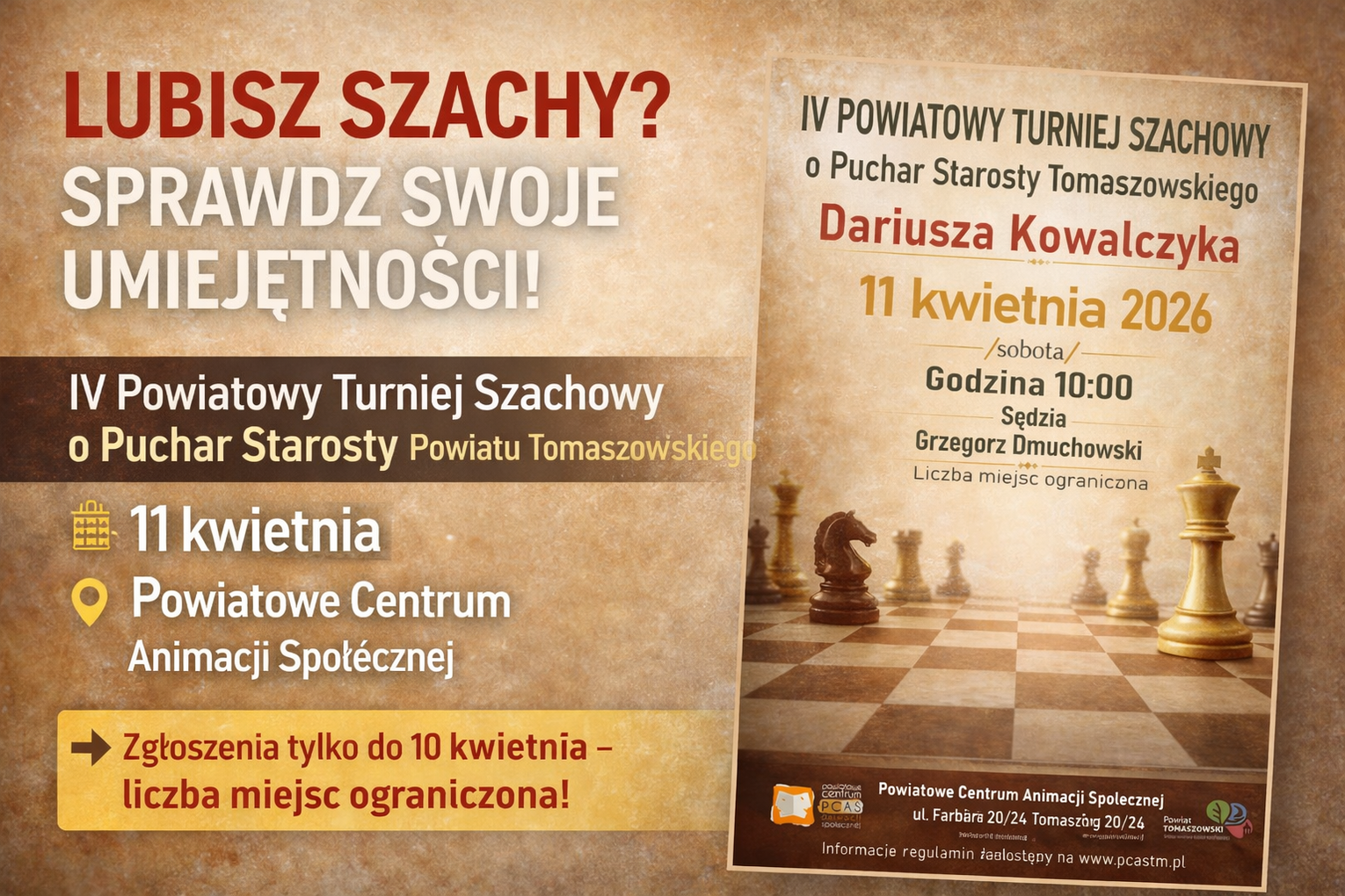 Tegoroczny Turniej Szachowy o Puchar Starosty Powiatu Tomaszowskiego po raz kolejny odbędzie się w Powiatowym Centrum Animacji Społecznej. Poprzednie edycje cieszyły się dużym zainteresowaniem, dlatego organizatorzy liczą, że również tym razem frekwencja dopisze, a przy szachownicach zasiądzie jeszcze więcej uczestników.