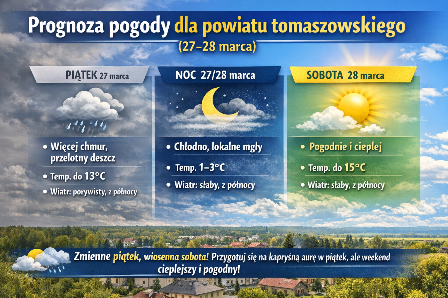 Według IMGW, nad Polską ścierają się wpływy Wyżu Azorskiego oraz niżu znad Bałkanów. Powiat tomaszowski znajduje się bliżej strefy oddziaływania niżu, dlatego pogoda będzie bardziej zmienna, z większym zachmurzeniem i okresowymi opadami.