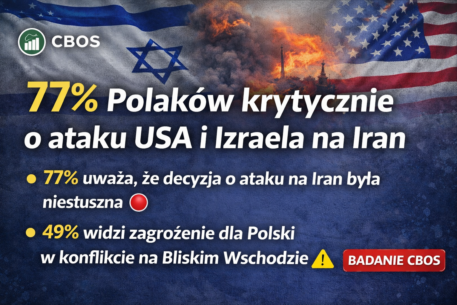 Badanie pokazuje również podzielone opinie w kwestii wpływu konfliktu na bezpieczeństwo Polski. 49 proc. respondentów uważa, że wojna na Bliskim Wschodzie stanowi zagrożenie dla naszego kraju (w tym 16 proc. „zdecydowanie”), natomiast 42 proc. nie dostrzega takiego ryzyka. 9 proc. nie ma zdania.