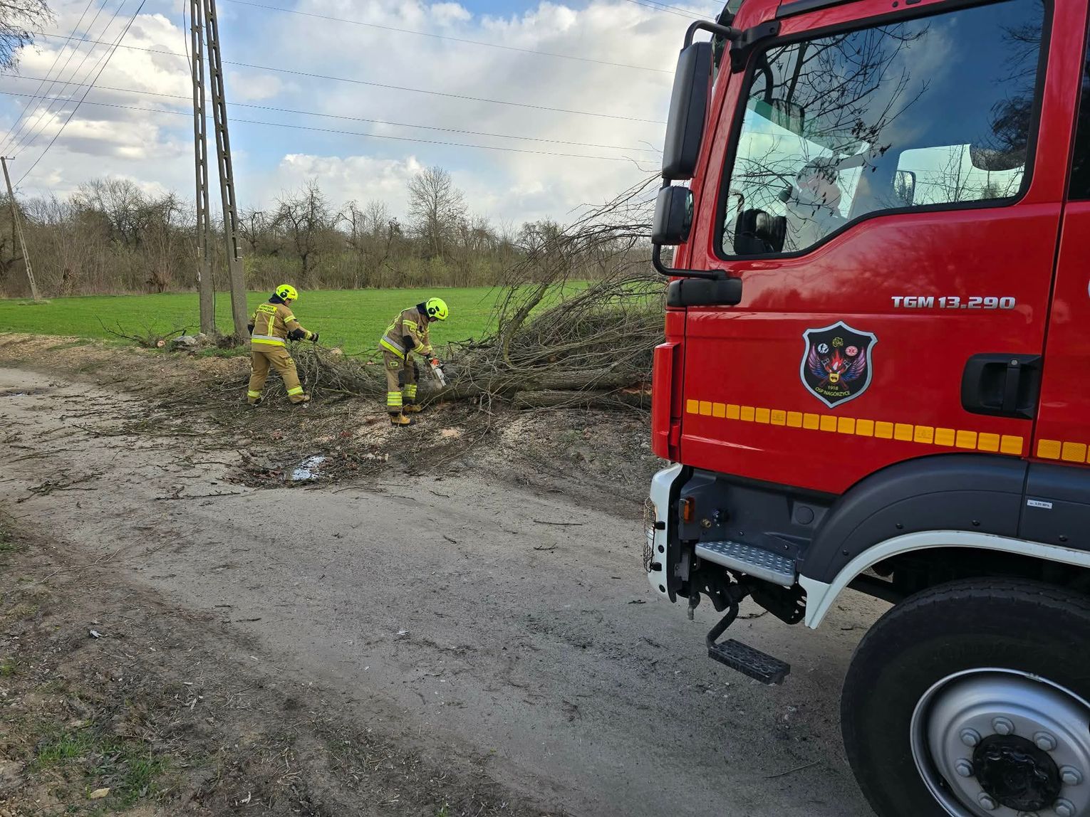 Również w powiecie tomaszowskim strażacy nie mieli chwili wytchnienia. Do działań ruszyły zarówno jednostki Państwowej Straży Pożarnej, jak i ochotnicy. Wśród nich druhowie z OSP w Nagórzycach, którzy aktywnie uczestniczyli w usuwaniu skutków wichury.