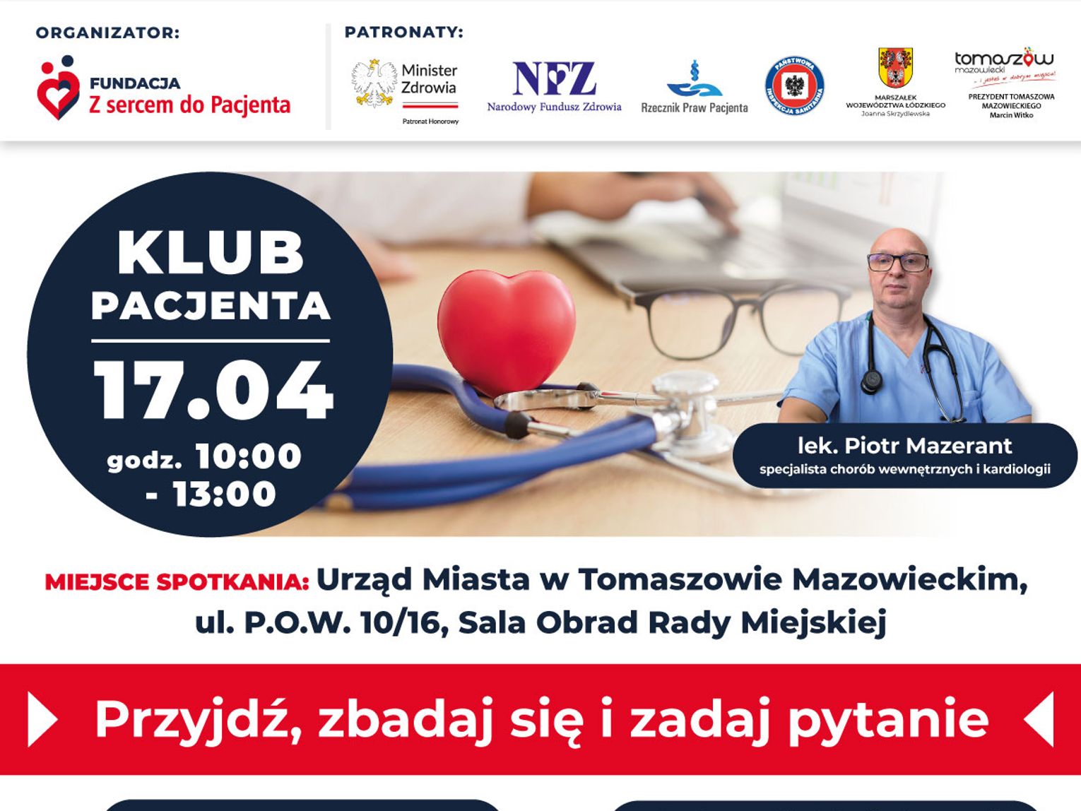Fundacja „Z sercem do Pacjenta” zaprasza na spotkanie w Klubie Pacjenta, które odbędzie się 17. 04. w godzinach 10-13 w Sali obrad Urzędu Miasta, ul. P.O.W. 10/16 (I piętro). Przyjdź, zbadaj się i zadaj pytanie! Czeka na Ciebie Strefa wiedzy o zdrowiu, Strefa porad i edukacji zdrowotnej oraz Strefa badań profilaktycznych (szczegóły na załączonym plakacie). Wydarzenie jest otwarte i bezpłatne!