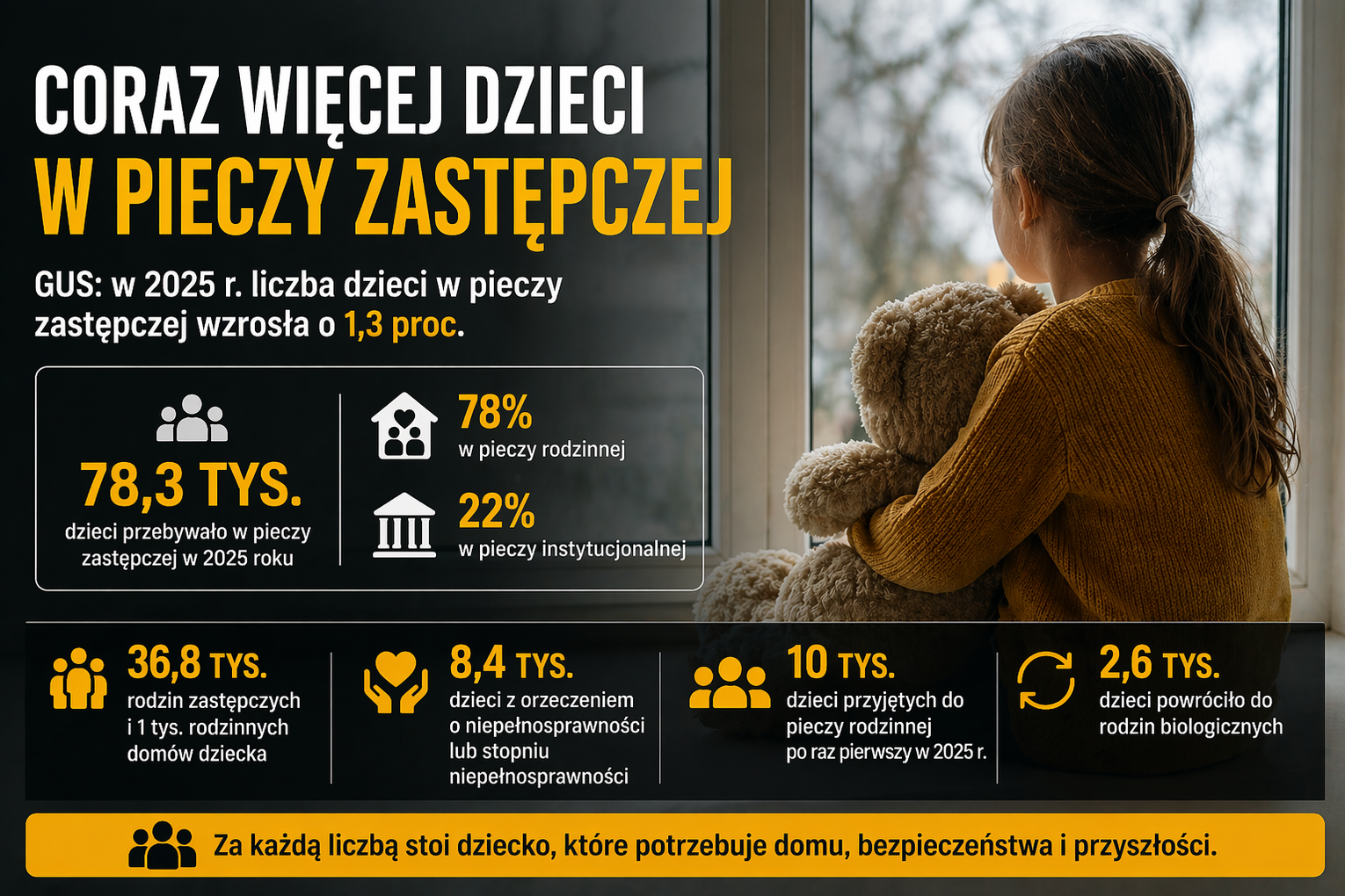 Dane GUS pokazują, że system pieczy zastępczej w Polsce wciąż stoi przed poważnymi wyzwaniami. Z jednej strony dominuje model rodzinny, uznawany za najlepszy dla rozwoju dziecka. Z drugiej – rosnąca liczba podopiecznych i duży udział placówek instytucjonalnych wskazują, że nie zawsze udaje się zapewnić każdemu dziecku miejsce w rodzinie.