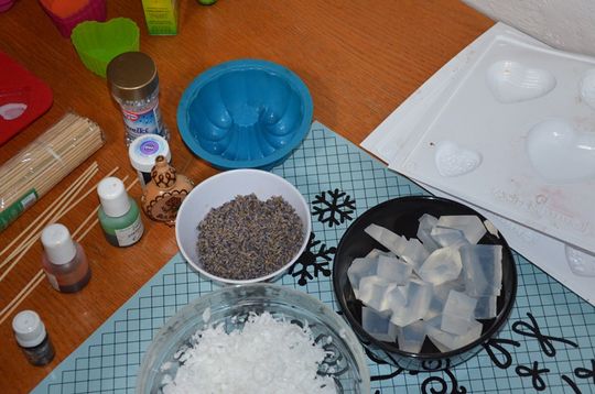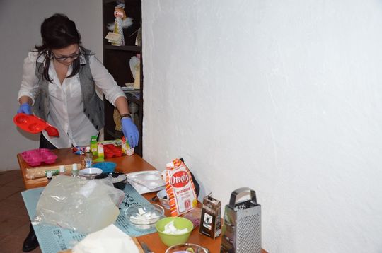 Na początku Pani Ania Bednarczyk wprowadziła uczestników warsztatów w tajniki robienia mydła. Trzeba było pokroić glicerynę, rozgrzać ją, dodać aromaty i barwniki, następnie pozwolić zadziałać fantazji wybrać foremkę, oraz dodatki takie jak ziarenka kawy, czy suszone płatki kwiatów.