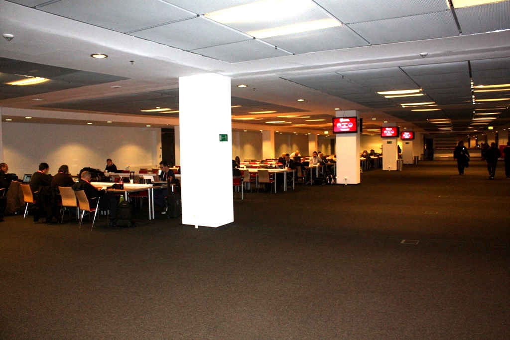 Dźwig osobowy zawiózł nas do specjalnego pomieszczenia tzw. Centrum Medialnego. Ogromna, wyciszona sala może pomieścić 800 osób. Przepięknie wyposażona i bardzo komfortowa. Są telewizory rozwieszone u sufitu, jest dostęp do Internetu, jest gdzie naładować telefon i jest punkt dla fotografów z akcesoriami do czyszczenia sprzętu.