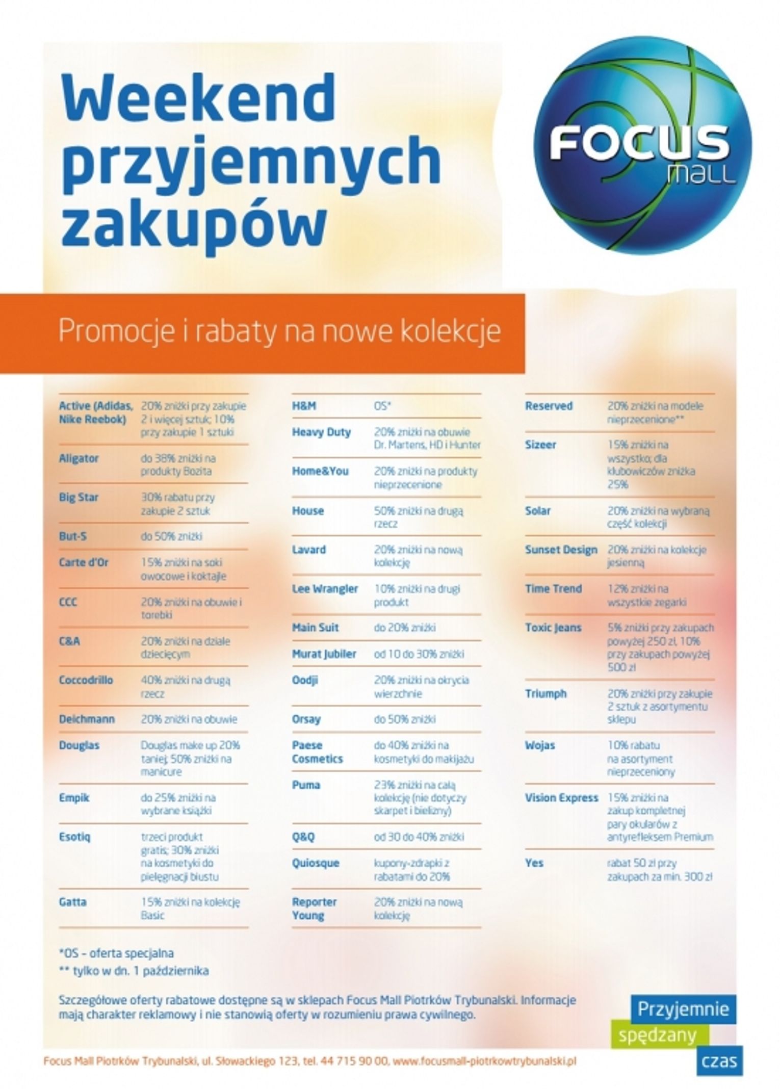 Sklepy znajdujące się w galerii przygotowały rabaty wynoszące nawet 50 proc. na nowe kolekcje oraz atrakcyjne oferty np. zakup drugiej rzeczy w dużo niższej cenie, nabycie trzech artykułów w cenie dwóch itp. Oferty te będą obowiązywały tylko w dniach 1-2 października br. w godzinach otwarcia galerii. To dobra okazja by uzupełnić garderobę o najmodniejsze w tym sezonie ubrania, obuwie i dodatki i przygotować się do zbliżających się chłodnych dni.