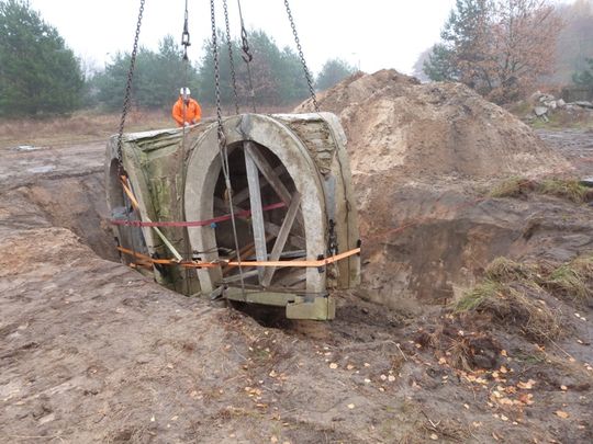 Sobotnia operacja w Skansenie Rzeki Pilicy miała na celu umieszczenie jednego ze wspomnianych wcześniej betonowych łączników w uprzednio przygotowanym wykopie. Właśnie ten fragment schronu, stanowiący jego środkową część, został odkryty jako pierwszy podczas ubiegłorocznych prac na Placu Kościuszki. I to od tego łącznika skansen rozpoczął rekonstruowanie tak niezwykłej budowli, które śmiało można nazwać bezprecedensowym wydarzeniem w naszym kraju. Wynika to z ogromnego ciężaru łącznika, przekraczającego 12 ton, jak i z faktu, iż budowniczowie tego schronu nigdy nie przewidywali jakichkolwiek jego przenosin!