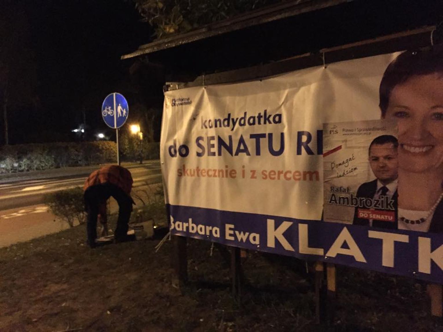 Przedwyborcza zabawa trwa dalej. Nocne wypady ekip plakatujących bywają pełne emocji i wrażeń. Dla zabawy można zakleić banery konkurenta własnymi plakatami, robiąc na złość... no właśnie nie wiadomo komu. Pan widoczny na fotografii nie przejął się nawet tym, że ktoś robi mu zdjęcie, a na zwróconą mu uwagę zareagował ordynarną agresją. Na szczęście do końca wyborczego cyrku pozostał już tylko nieco ponad tydzień.