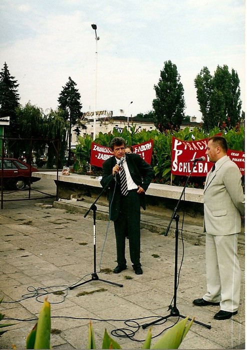 Lider AWS Marian Krzaklewski, zwany pięknym Mańkiem przyparty do muru przez tomaszowskich wyborców