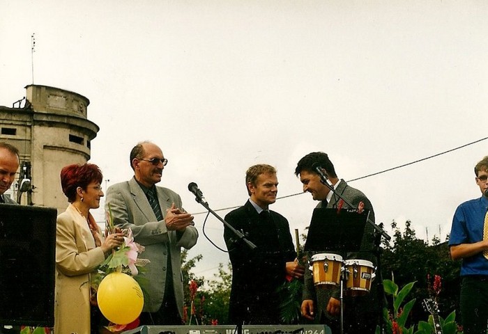 Pretendenci! Kandydaci PO na posłów Ela Radziszewska, Sławek Żegota, i Leszek Jakubowski z Donaldem na Placu Kościuszki - wybory 2001. Ela oczywiście "wyślizgała" chłopaków na cacy