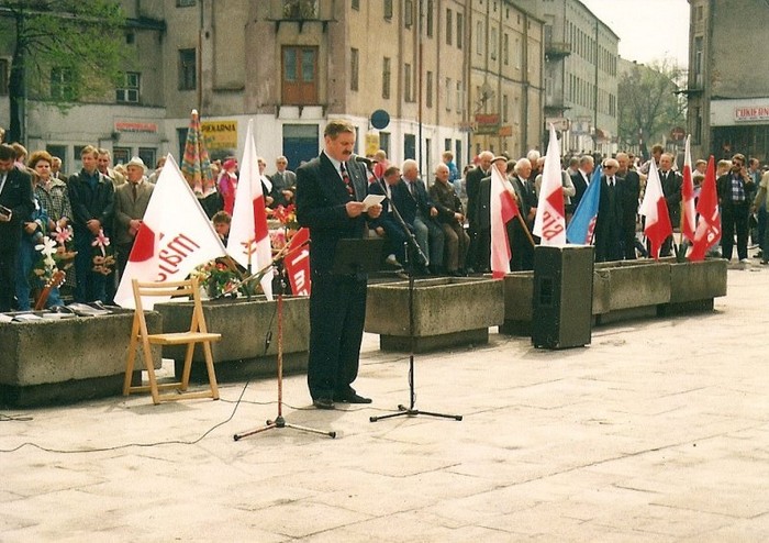 Jeszcze raz 1 Maja. Przemawia senator Jerzy Adamski. W tle działacze socjaldemokratycznej młodzieżówki.