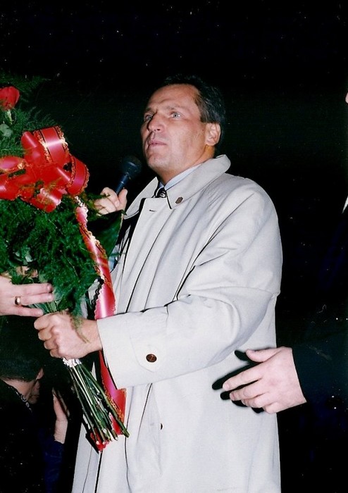 Kwiaty? A już myślałem, że przesadziłem obiecując mieszkanie dla każdego. - kampania wyborcza 1995 - na fontannie przy Pl. Kościuszki