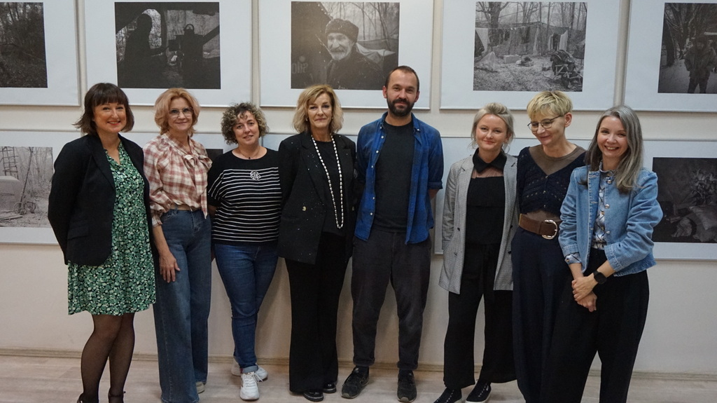 Pamiątkowe ujęcie w czytelni MBP w Tomaszowie Mazowieckim; uczestnicy stoją przed cyklem fotografii dokumentalnych poruszających temat wrażliwości społecznej i bezdomności.