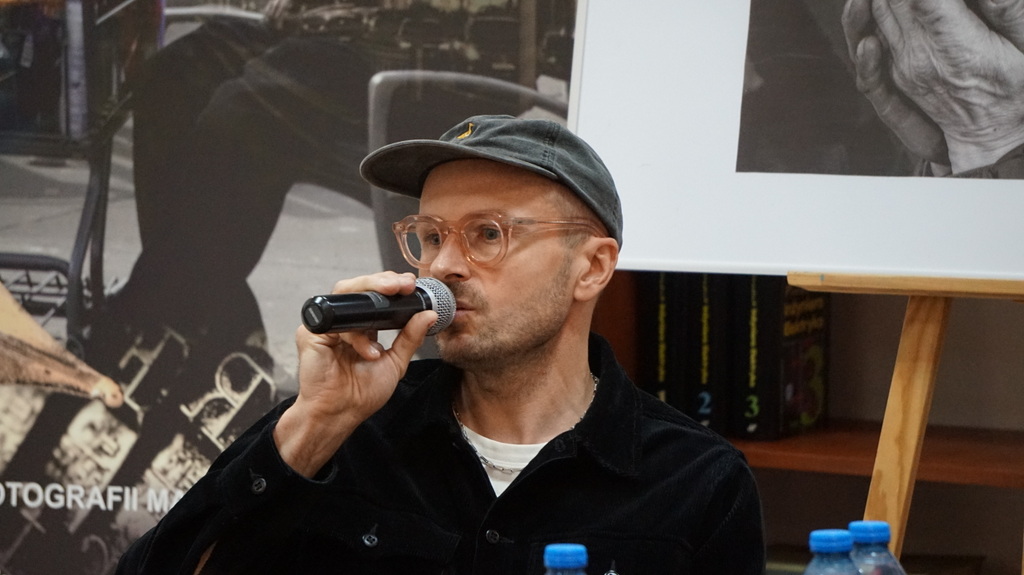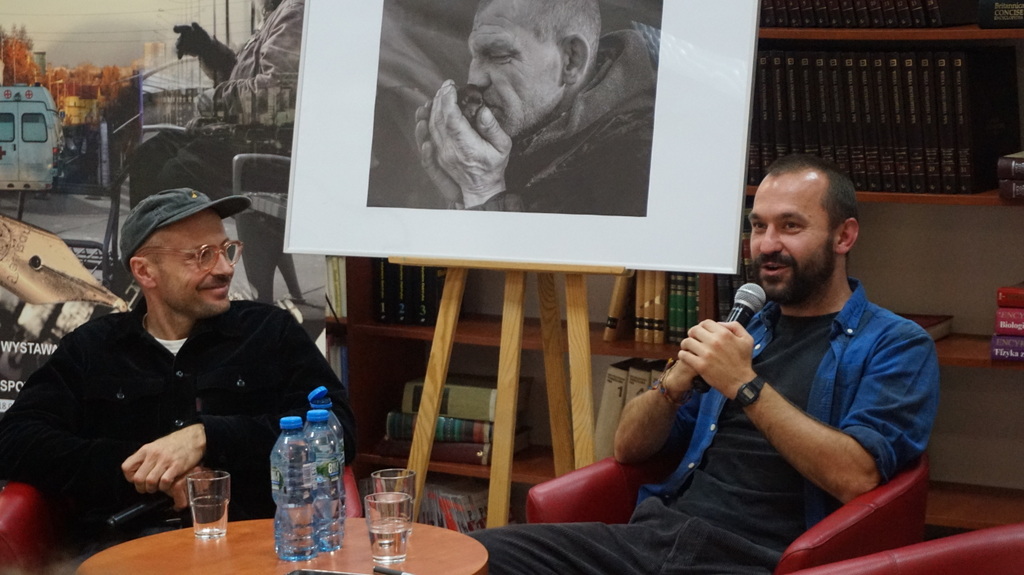 Zbliżenie na część dyskusyjną spotkania autorskiego; tematem są empatia, odpowiedzialność i obraz dokumentujący codzienność osób w kryzysie bezdomności.